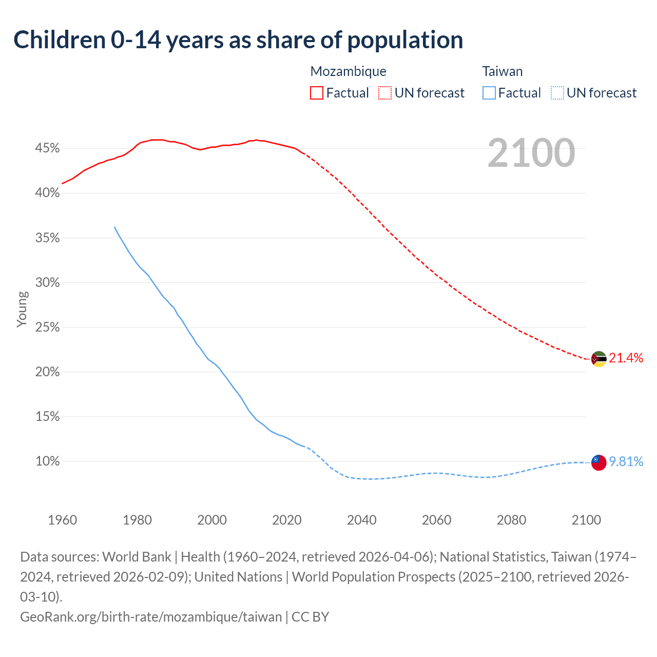 Data sources: World Bank | Health (1960–2024, retrieved 2026-04-06); National Statistics, Taiwan (1974–2024, retrieved 2026-02-09); United Nations | World Population Prospects (2025–2100, retrieved 2026-03-10).