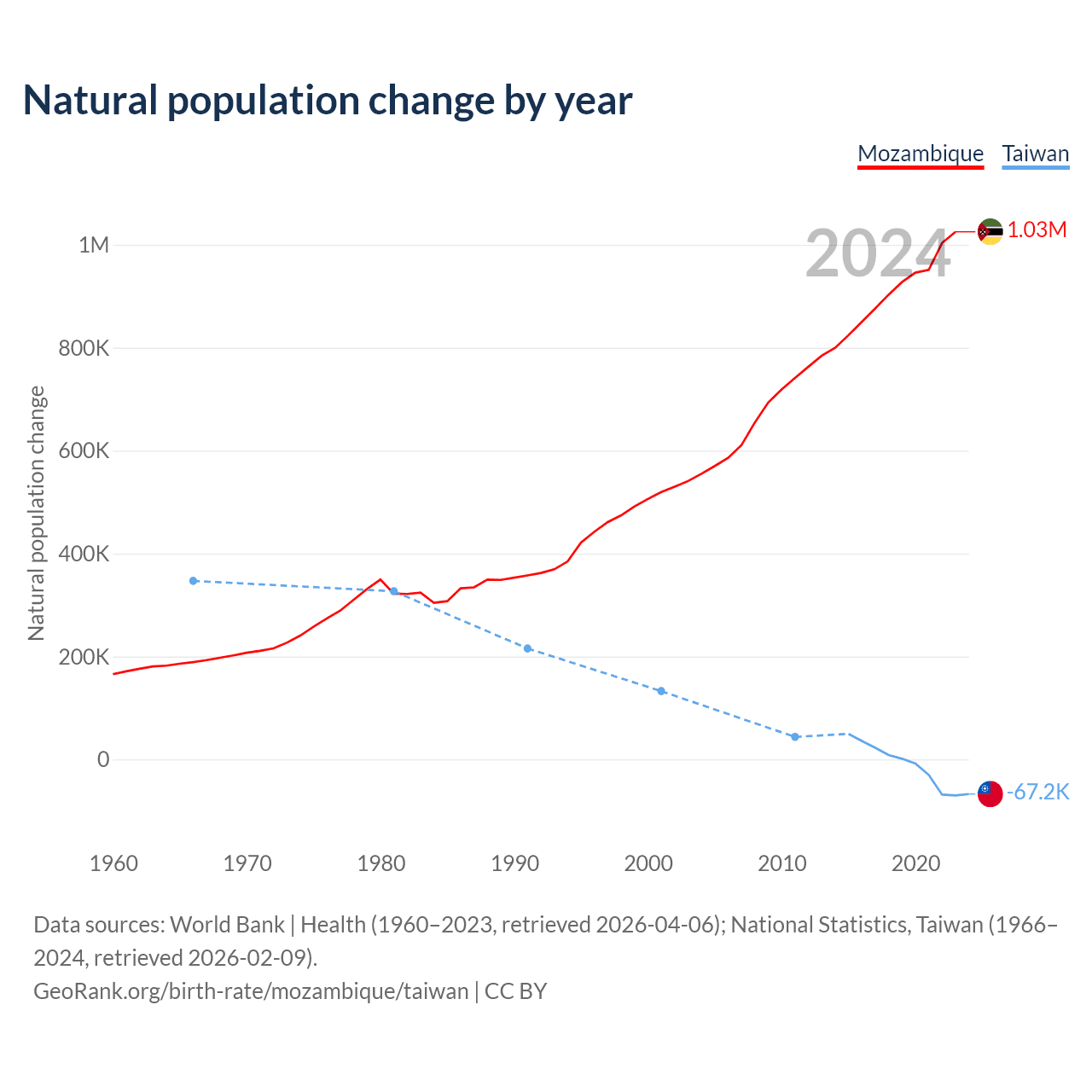 Data sources: World Bank | Health (1960–2023, retrieved 2026-04-06); National Statistics, Taiwan (1951–2024, retrieved 2026-02-09).