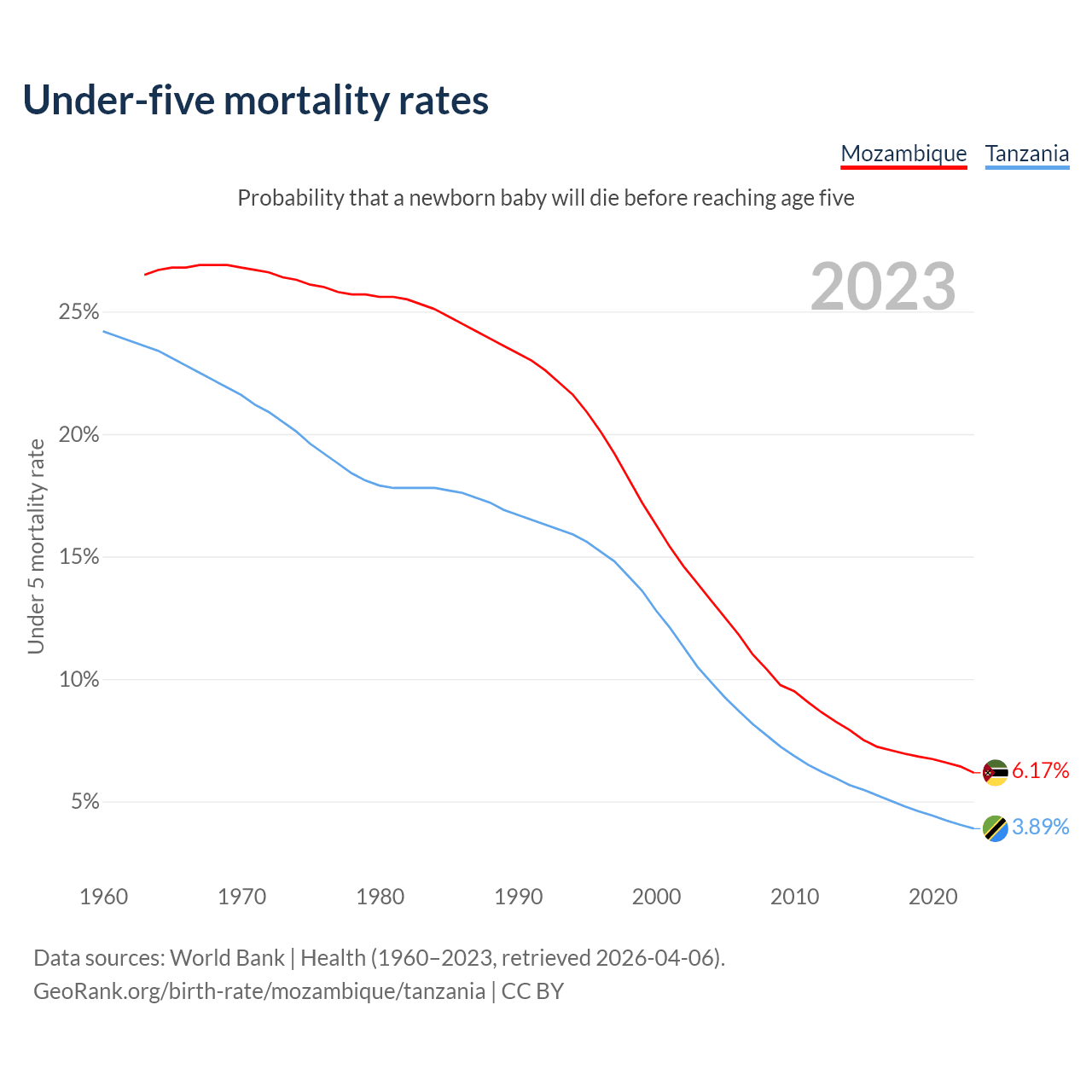 The chance that a newborn baby will die before reaching age five is 6.17% in Mozambique and 3.89% in Tanzania. Above is a chart with historical data on under-five mortality rates.