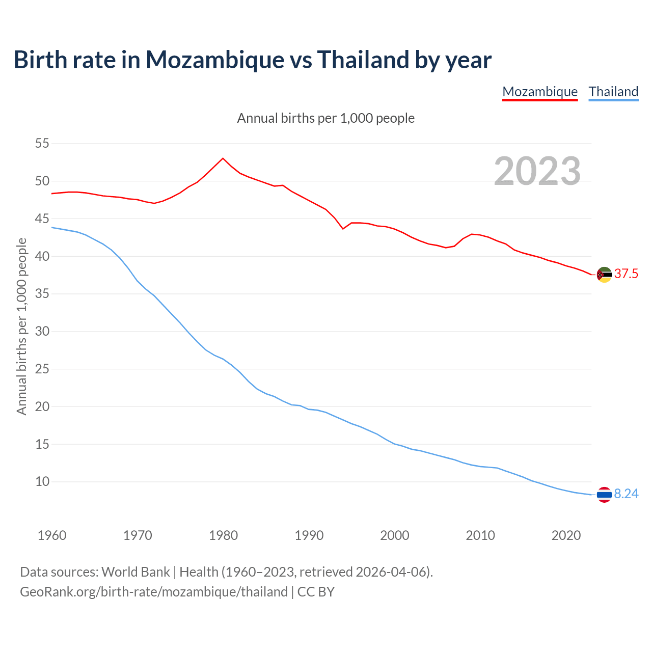 Mozambique has an annual birth rate of 37.5 births per 1,000 people, compared to 8.24 for Thailand. The average number of children a woman is expected to have during her lifetime — the fertility rate, is 4.76 in Mozambique and 1.21 in Thailand — 74.6% difference.