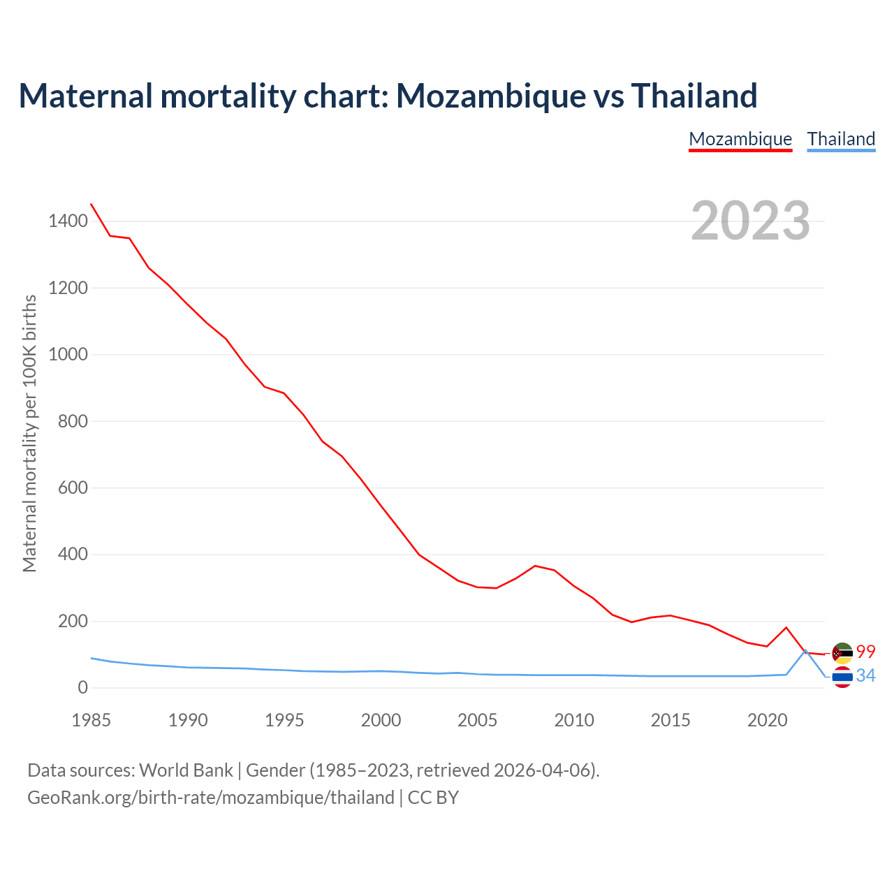 The maternal mortality rate, which is the probability of dying during childbirth or within 42 days of pregnancy termination, is 99 deaths per 100,000 live births in Mozambique, compared to 34 deaths in Thailand.