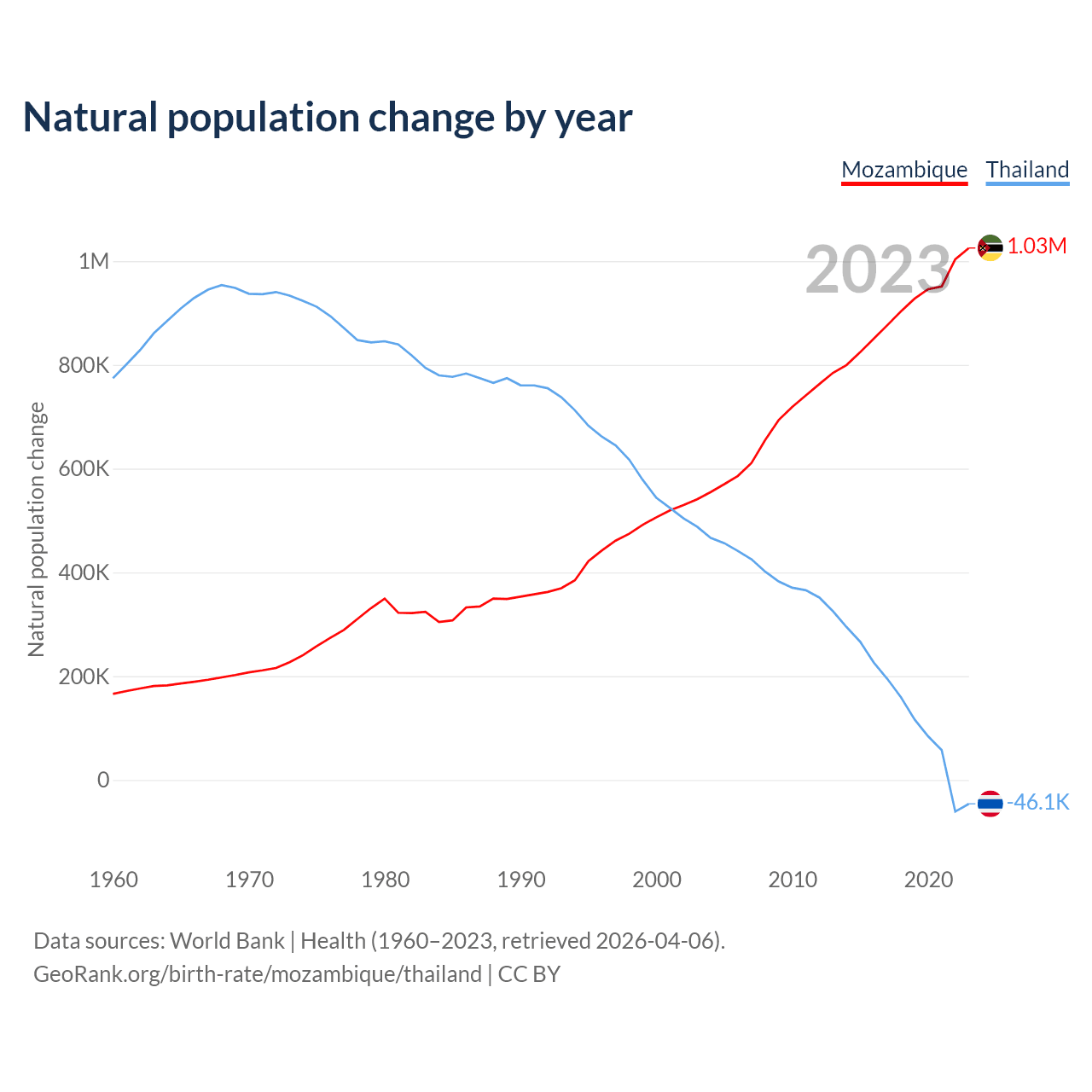 According to the latest available data on birth rates, the fertility rate in Mozambique was 4.76 children per woman in 2023, compared to 1.21 in Thailand in 2023. The replacement level is considered to be 2.1 children per woman.