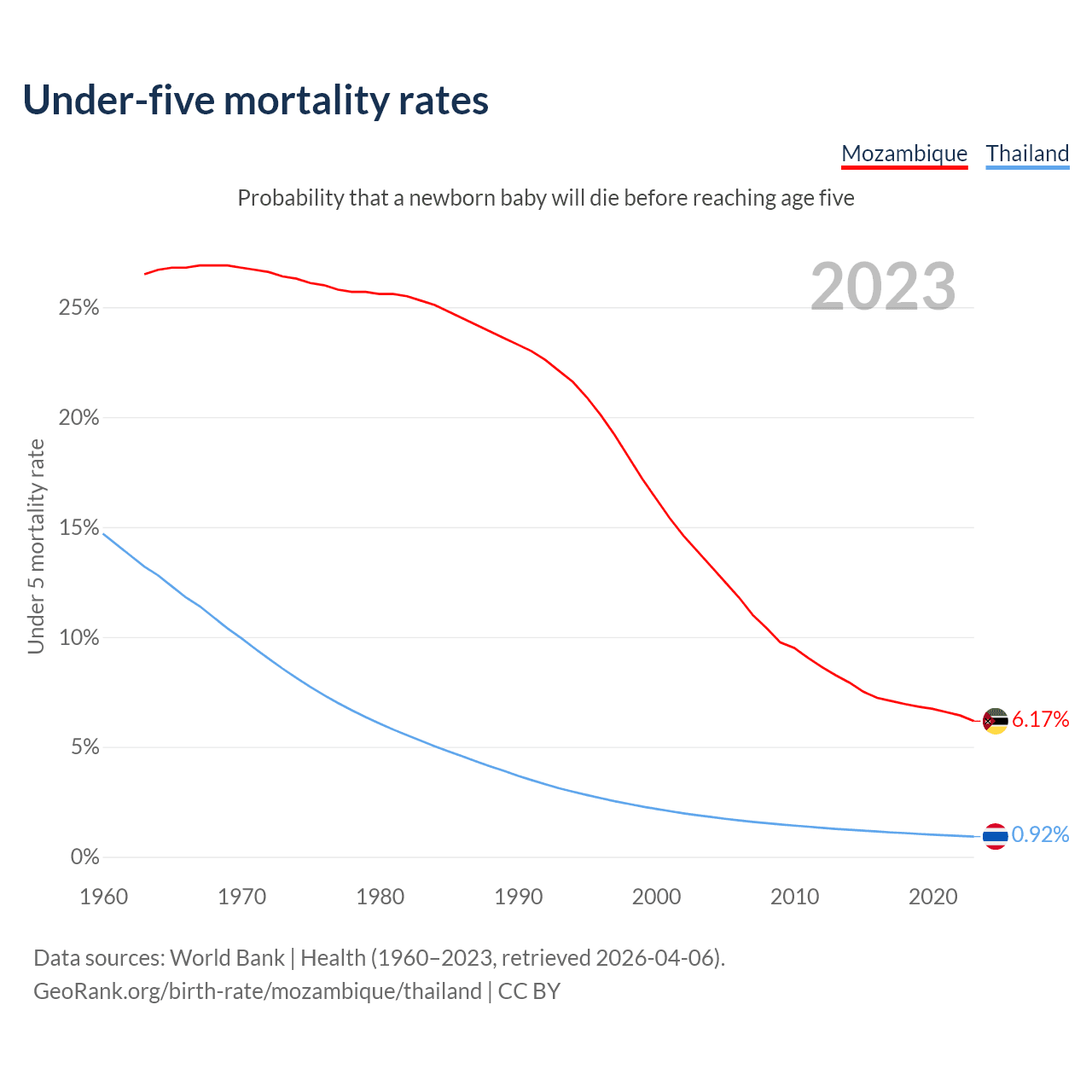The chance that a newborn baby will die before reaching age five is 6.17% in Mozambique and 0.92% in Thailand. Above is a chart with historical data on under-five mortality rates.