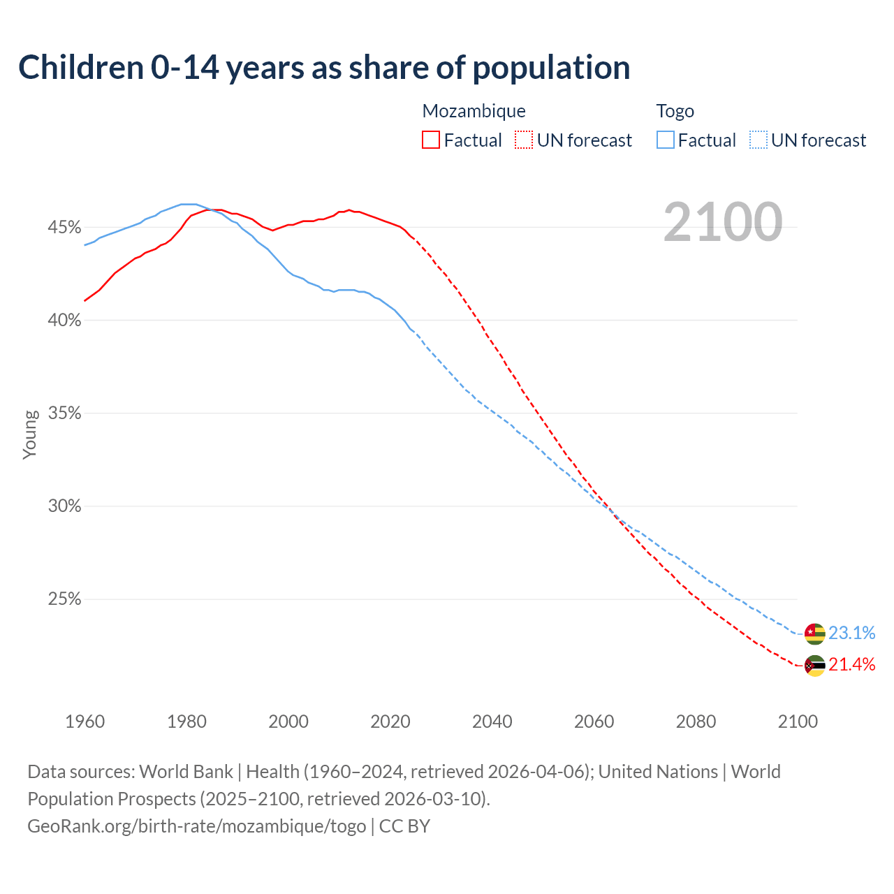 Mozambique has an annual birth rate of 37.5 births per 1,000 people, compared to 31.1 for Togo. The average number of children a woman is expected to have during her lifetime — the fertility rate, is 4.76 in Mozambique and 4.19 in Togo — 12% difference.