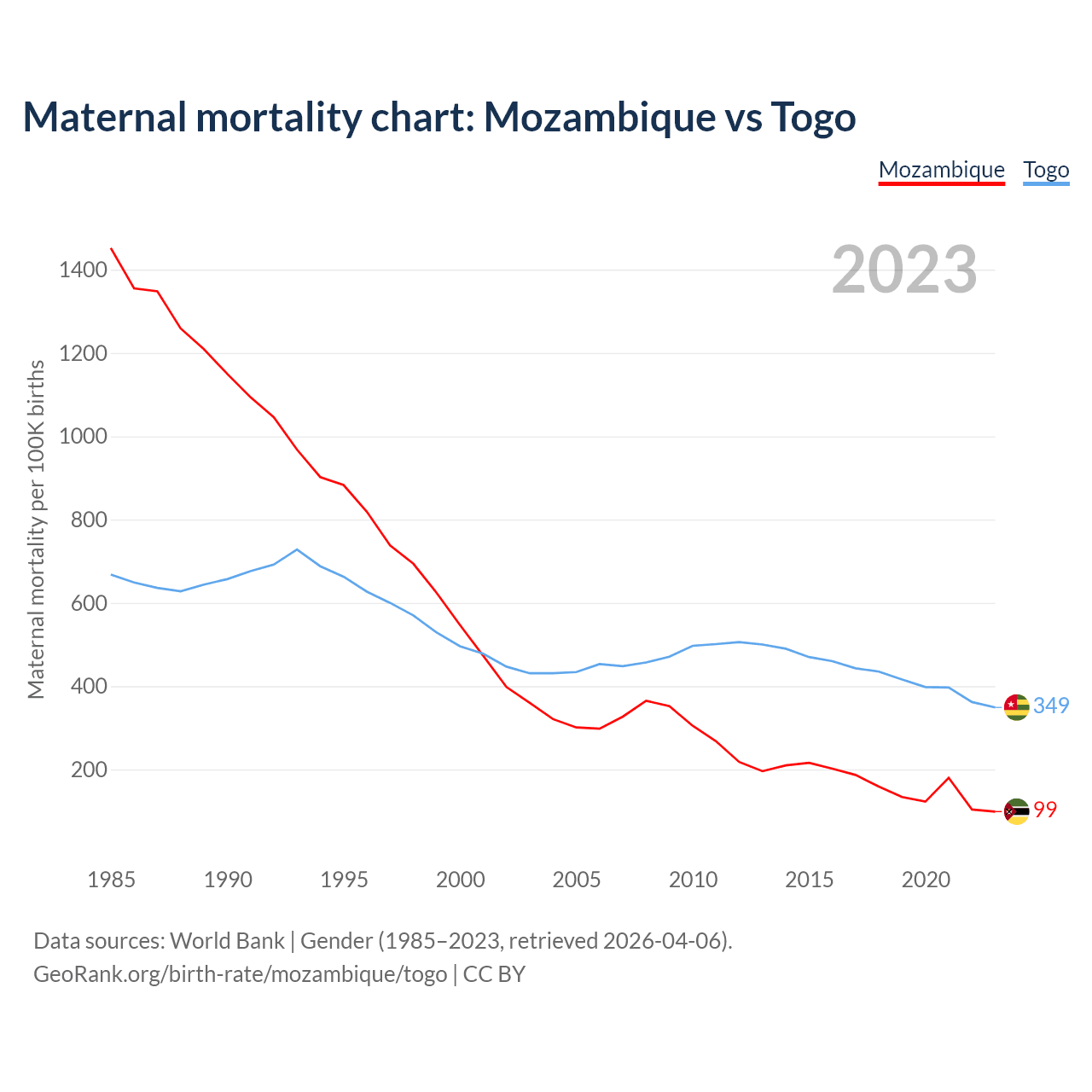 - Annual births per 1,000 women ages 15-19 (adolescent birth rate or teenage mother rate) is 153.5 in Mozambique vs 77.1 in Togo.