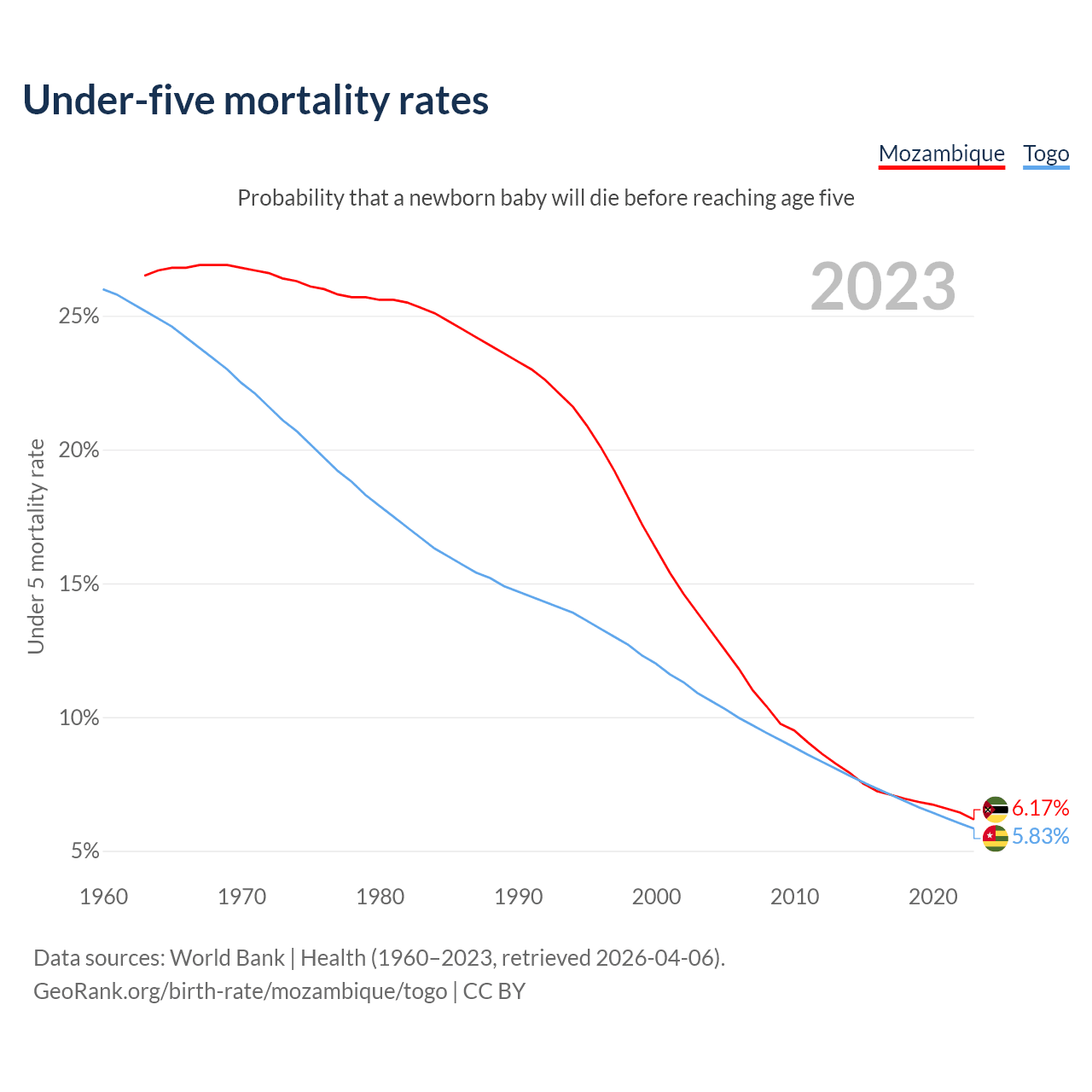 The chance that a newborn baby will die before reaching age five is 6.17% in Mozambique and 5.83% in Togo. Above is a chart with historical data on under-five mortality rates.
