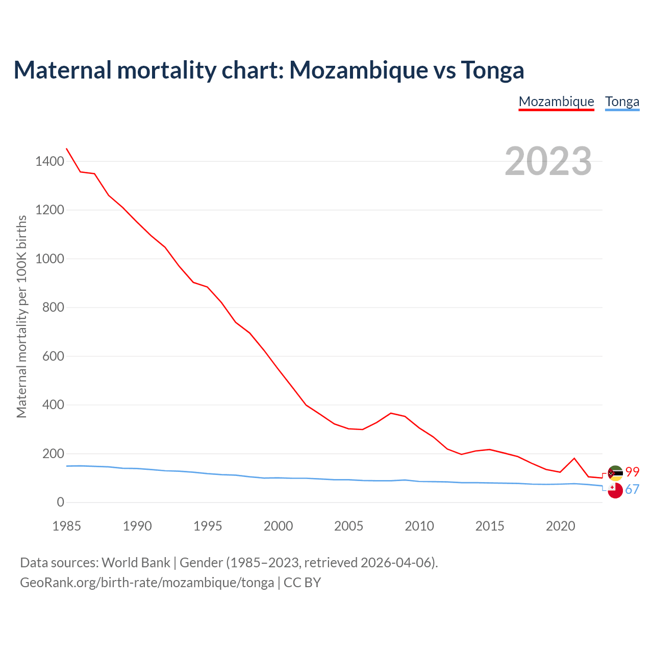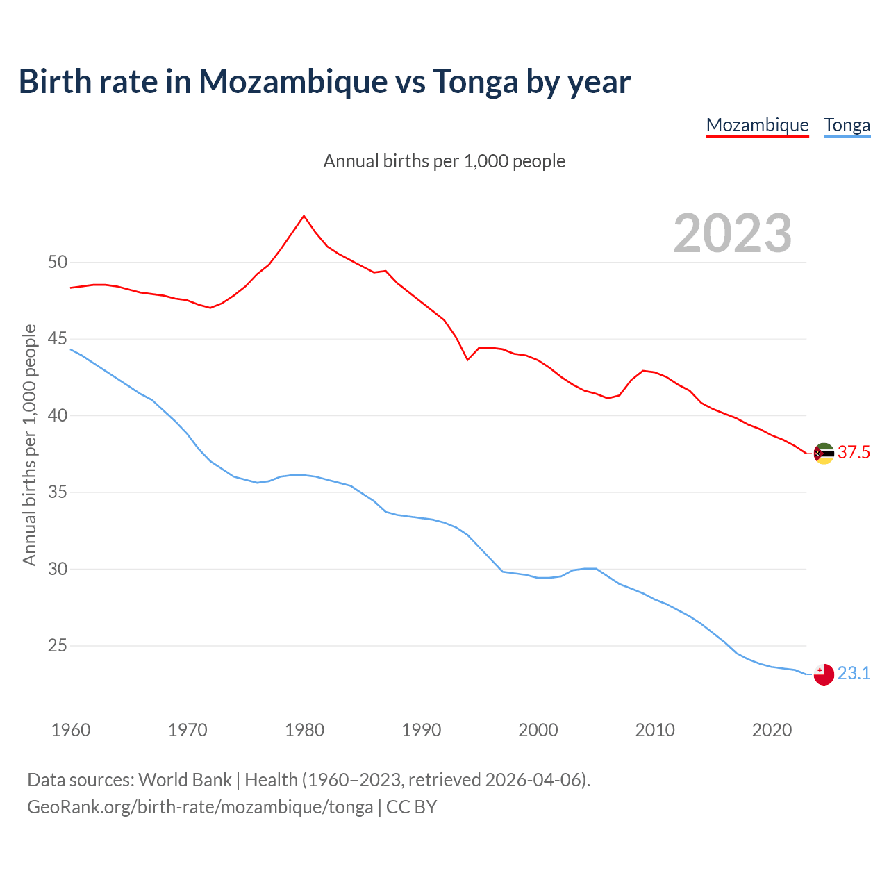 Mozambique has an annual birth rate of 37.5 births per 1,000 people, compared to 23.1 for Tonga. The average number of children a woman is expected to have during her lifetime — the fertility rate, is 4.76 in Mozambique and 3.13 in Tonga — 34.3% difference.
