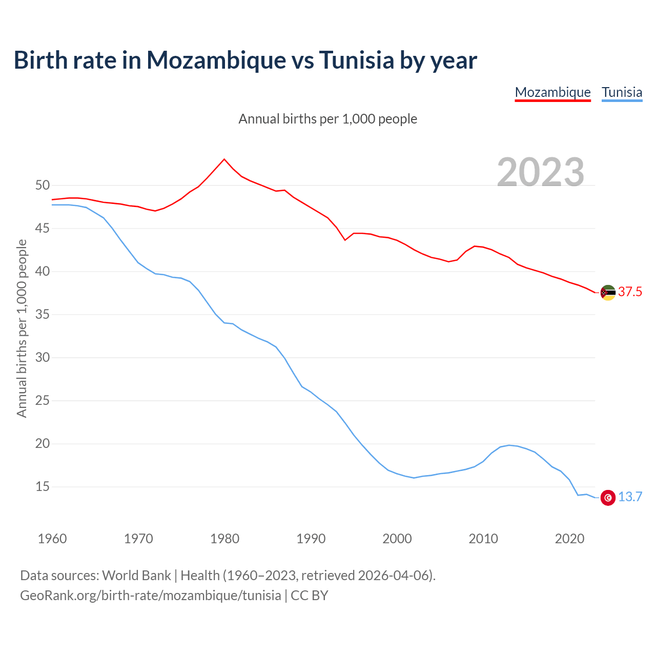 Mozambique has an annual birth rate of 37.5 births per 1,000 people, compared to 13.7 for Tunisia. The average number of children a woman is expected to have during her lifetime — the fertility rate, is 4.76 in Mozambique and 1.83 in Tunisia — 61.5% difference.