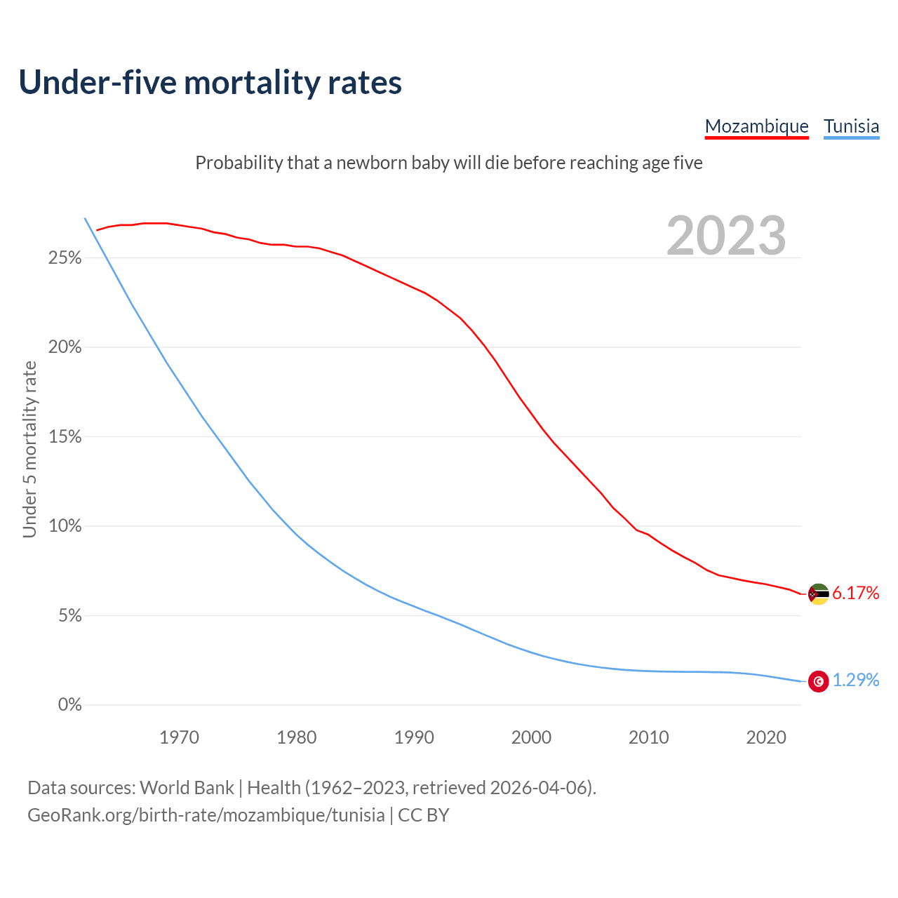 The chance that a newborn baby will die before reaching age five is 6.17% in Mozambique and 1.29% in Tunisia. Above is a chart with historical data on under-five mortality rates.