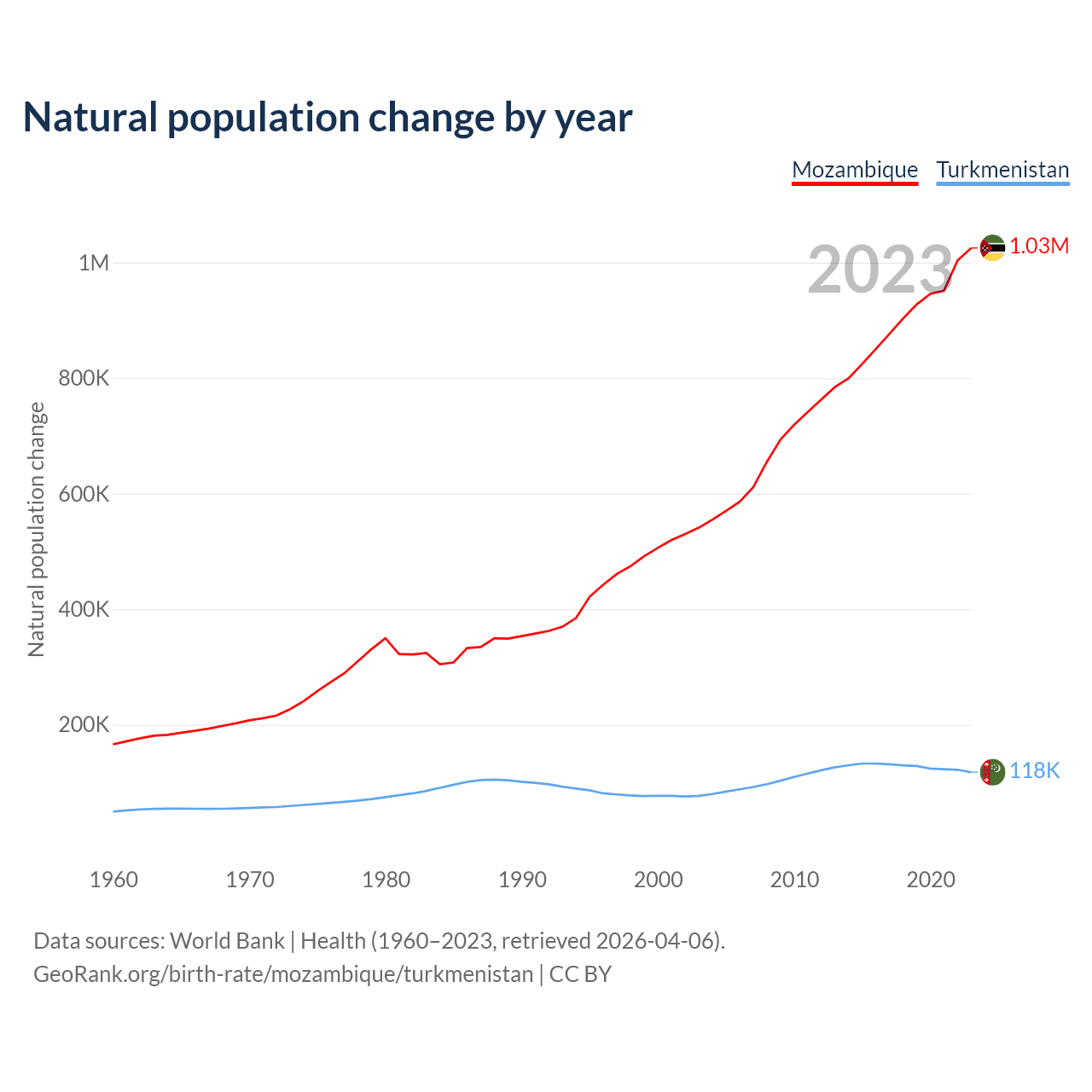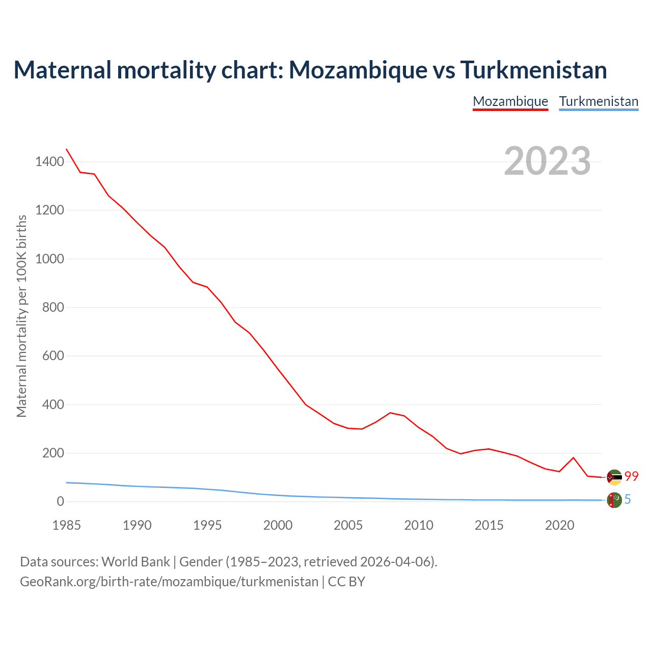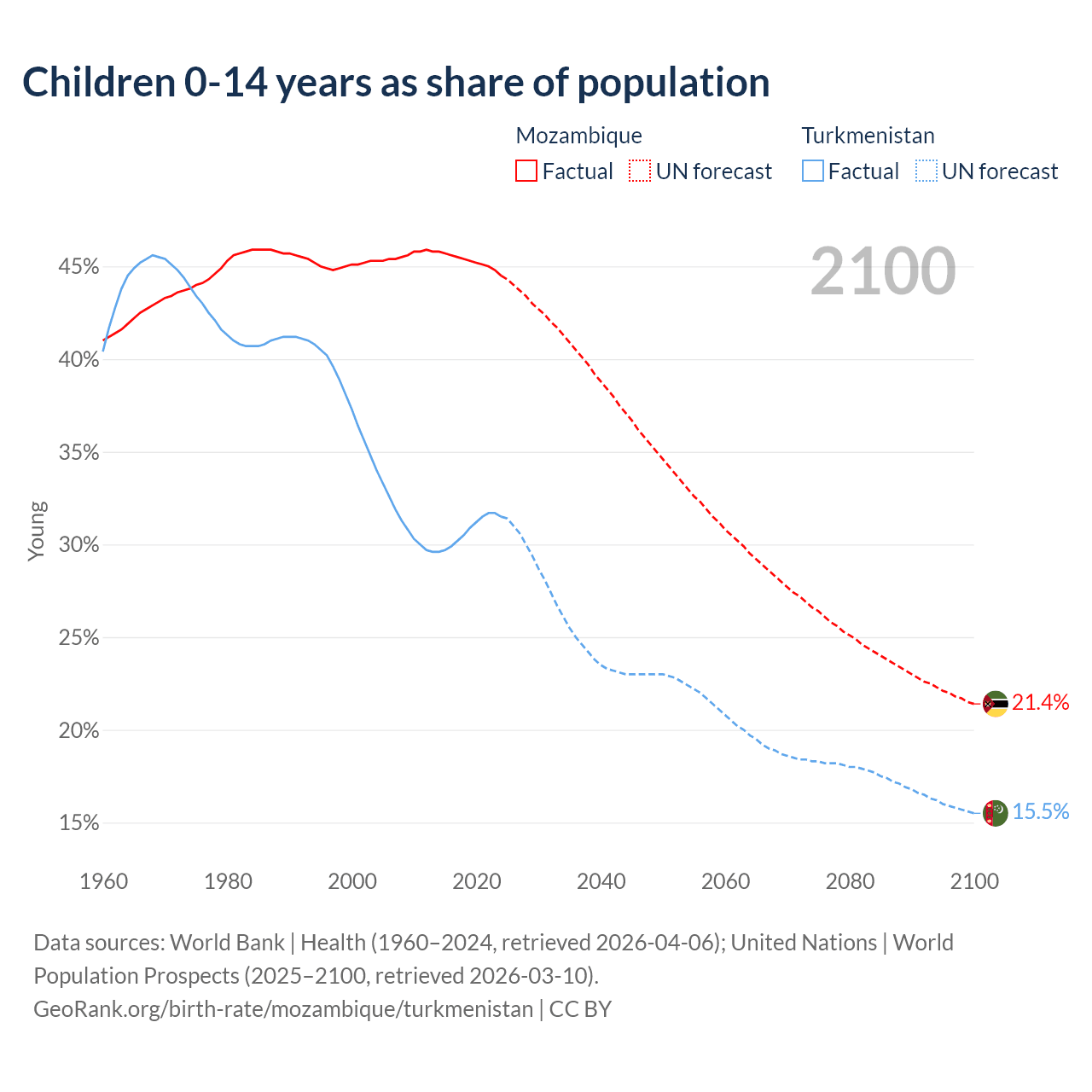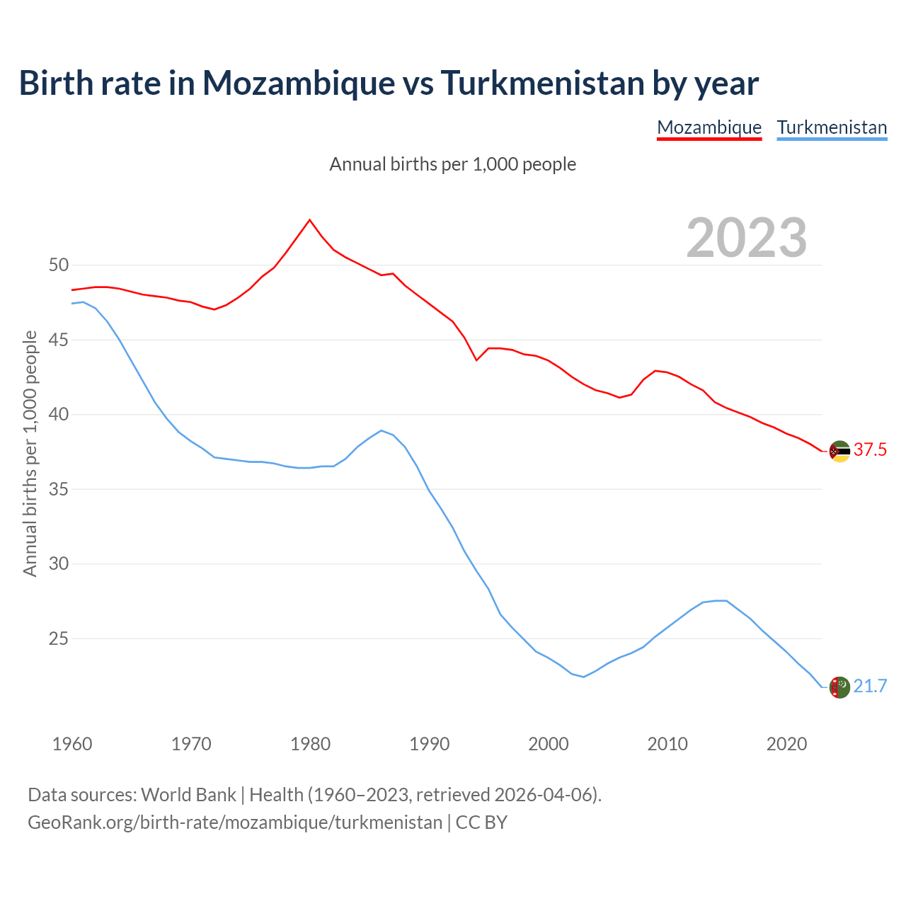 Mozambique has an annual birth rate of 37.5 births per 1,000 people, compared to 21.7 for Turkmenistan. The average number of children a woman is expected to have during her lifetime — the fertility rate, is 4.76 in Mozambique and 2.69 in Turkmenistan — 43.5% difference.