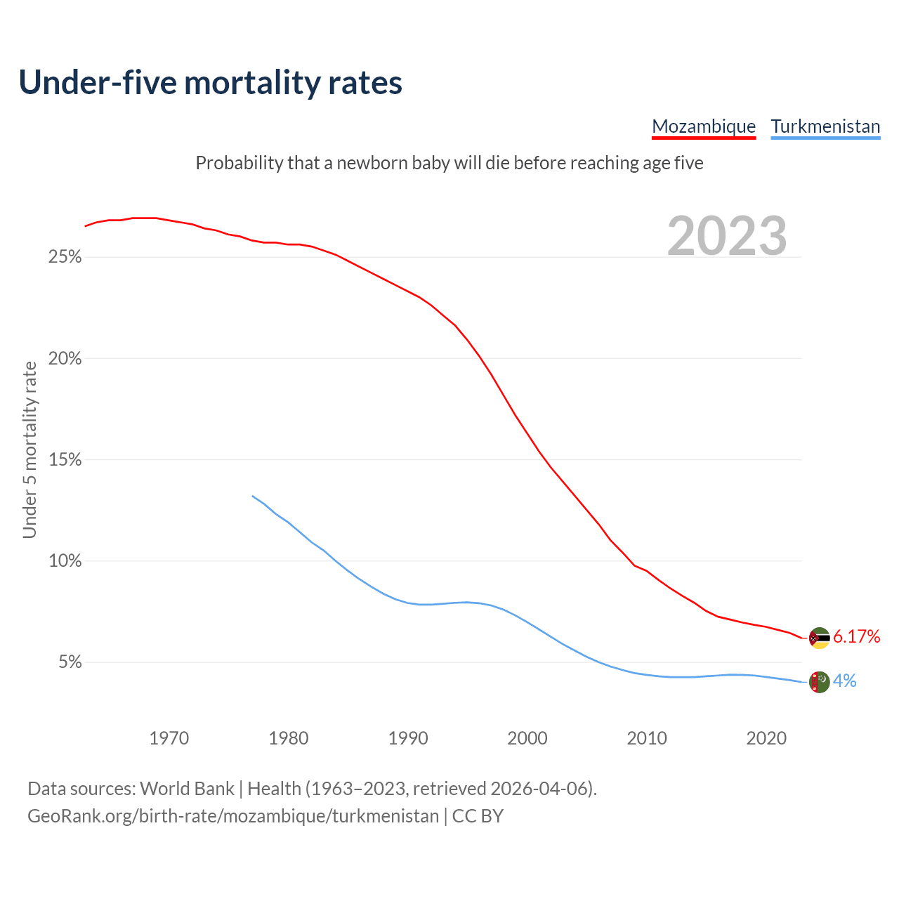 The chance that a newborn baby will die before reaching age five is 6.17% in Mozambique and 4% in Turkmenistan. Above is a chart with historical data on under-five mortality rates.