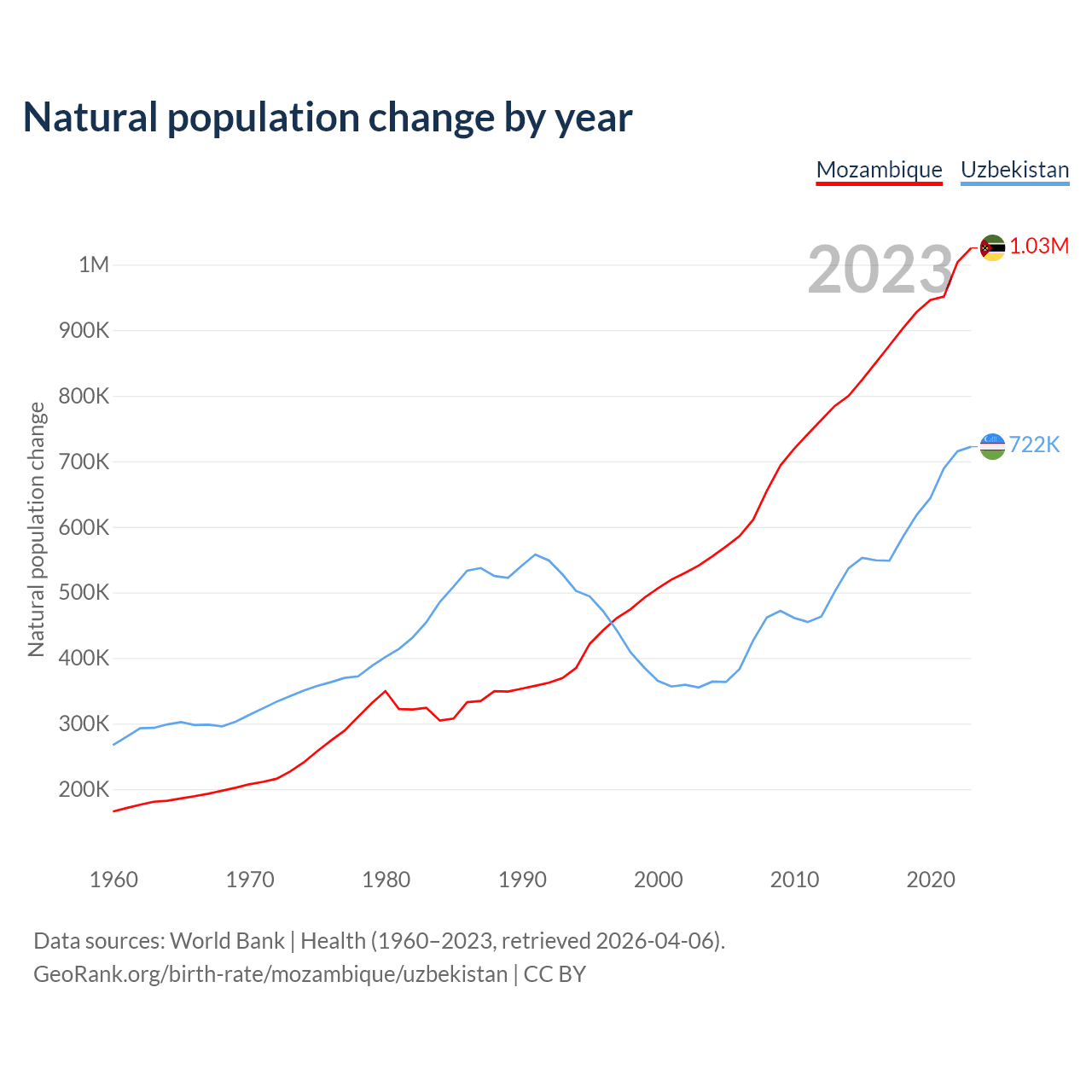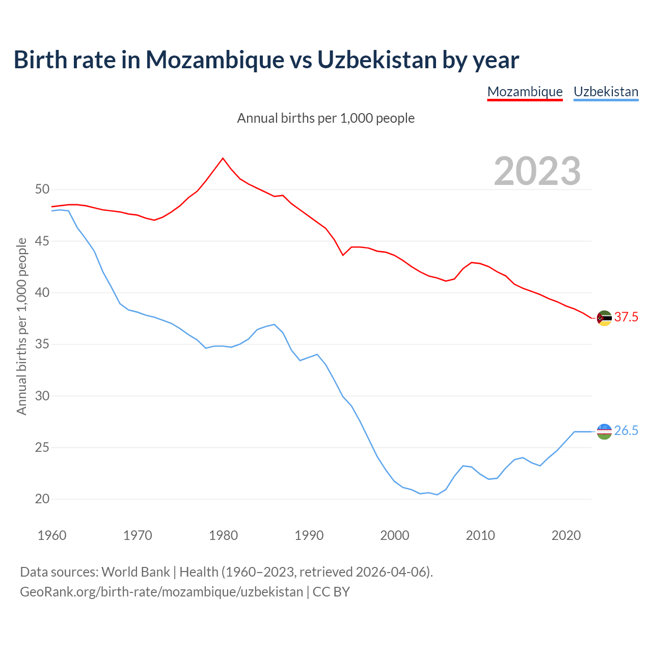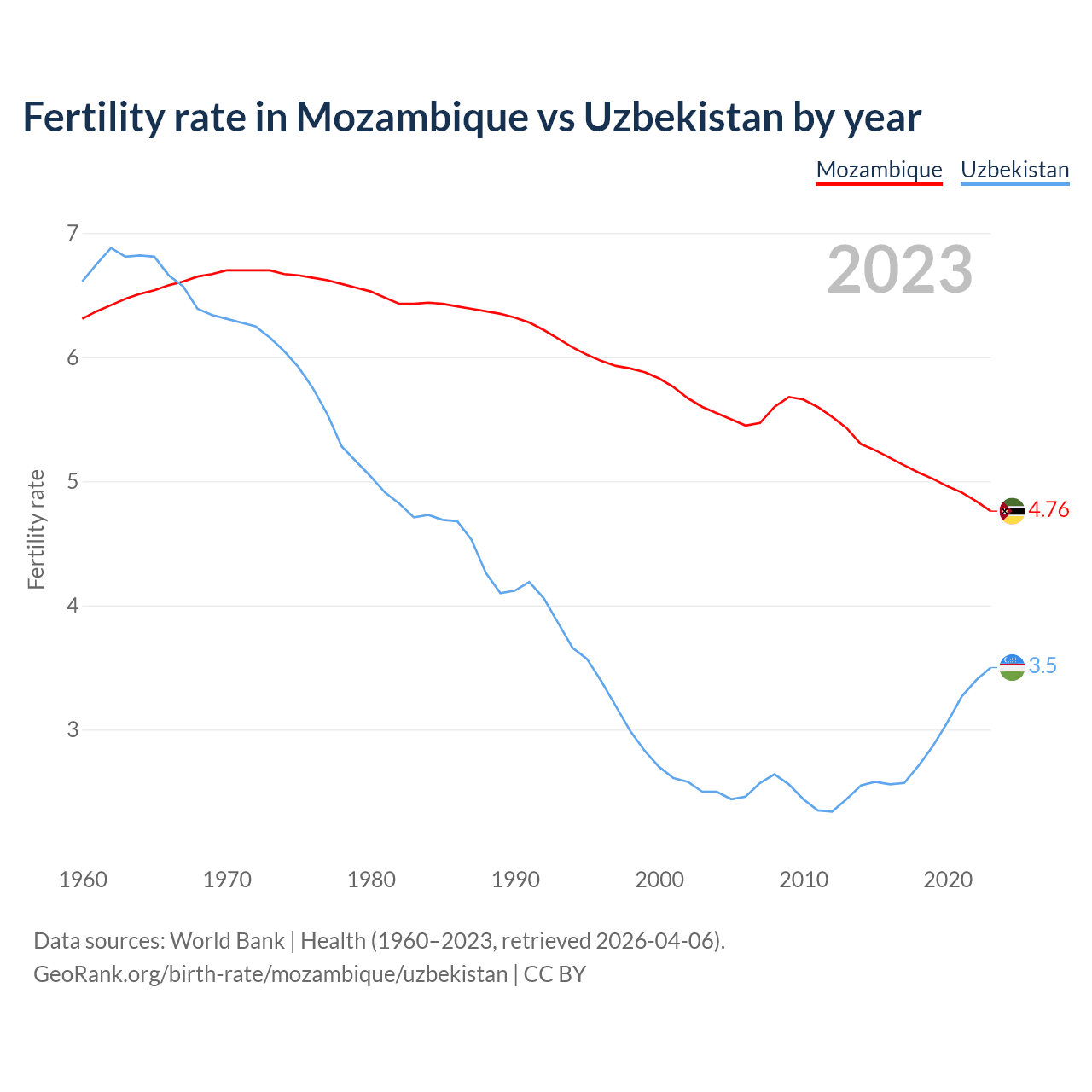 Mozambique has an annual birth rate of 37.5 births per 1,000 people, compared to 26.5 for Uzbekistan. The average number of children a woman is expected to have during her lifetime — the fertility rate, is 4.76 in Mozambique and 3.5 in Uzbekistan — 26.5% difference.