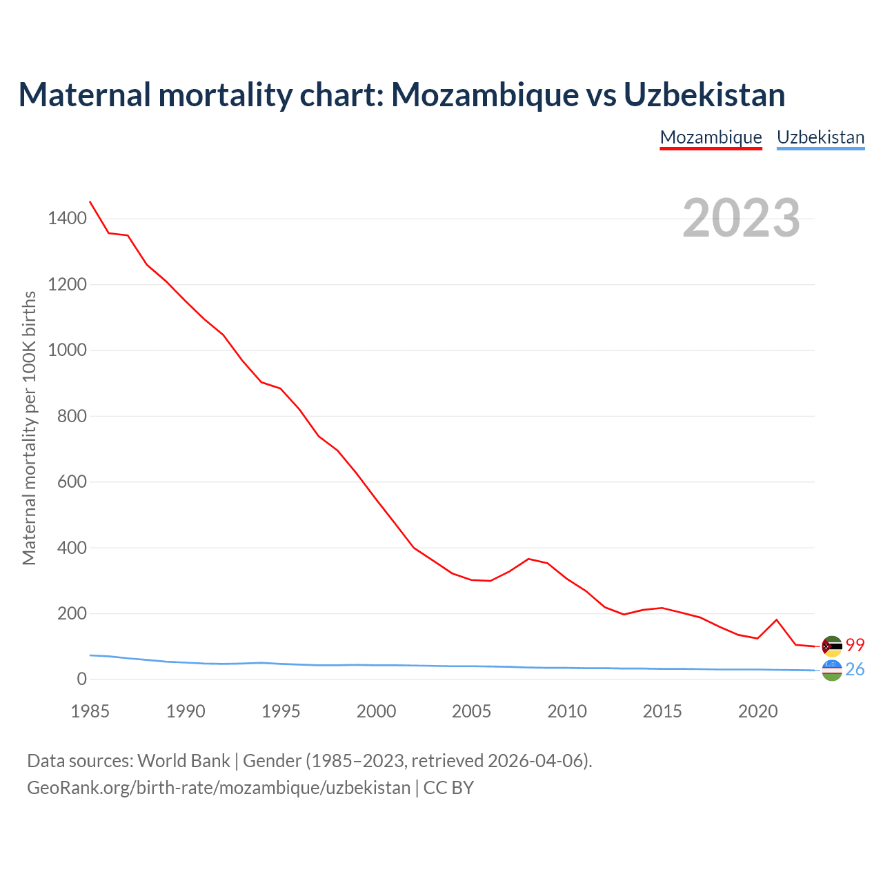 The maternal mortality rate, which is the probability of dying during childbirth or within 42 days of pregnancy termination, is 99 deaths per 100,000 live births in Mozambique, compared to 26 deaths in Uzbekistan.