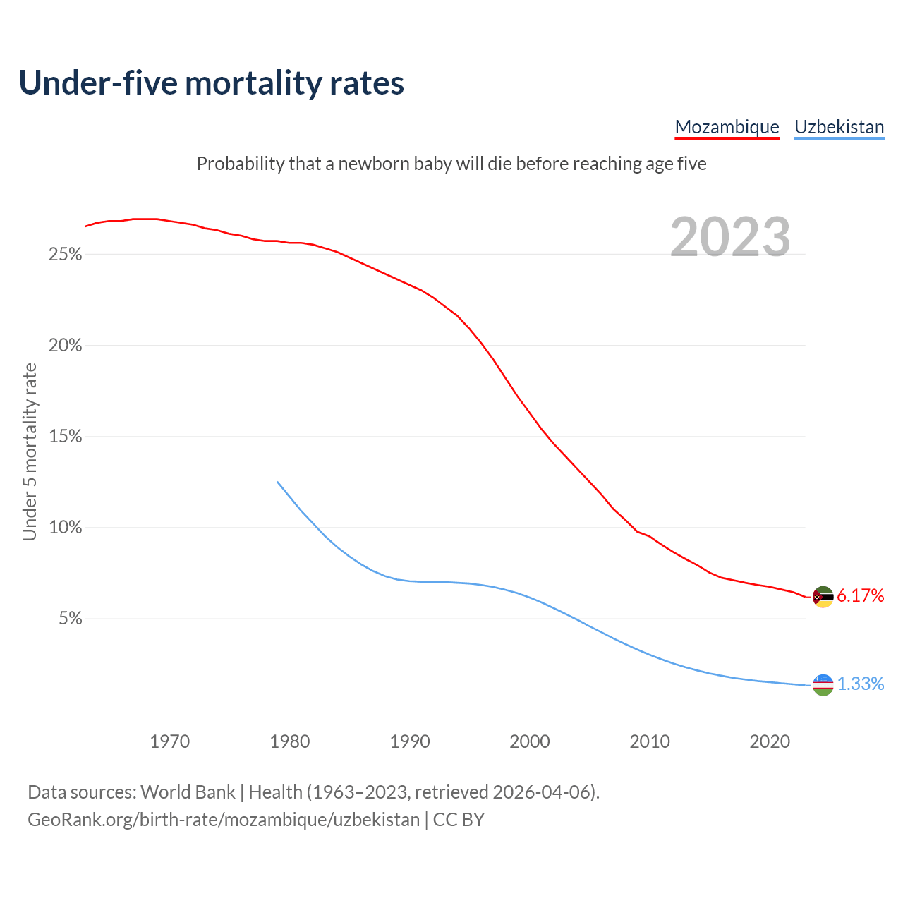 The chance that a newborn baby will die before reaching age five is 6.17% in Mozambique and 1.33% in Uzbekistan. Above is a chart with historical data on under-five mortality rates.
