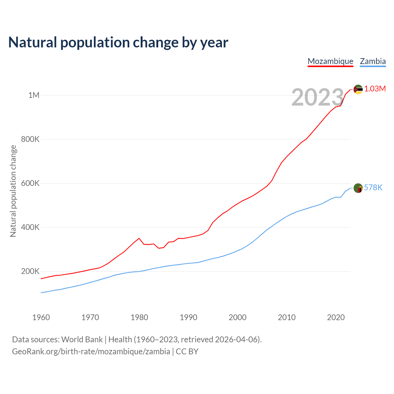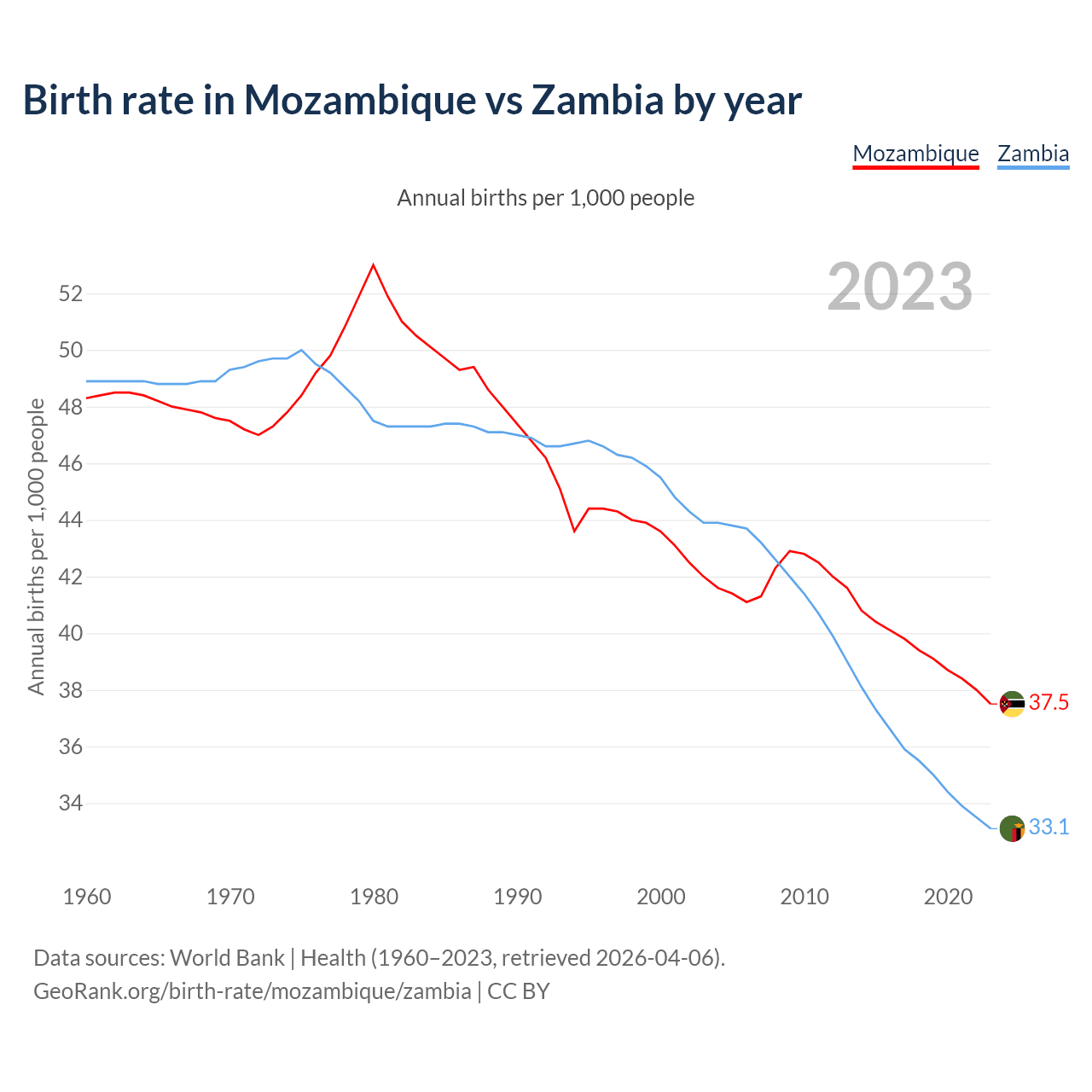 Mozambique has an annual birth rate of 37.5 births per 1,000 people, compared to 33.1 for Zambia. The average number of children a woman is expected to have during her lifetime — the fertility rate, is 4.76 in Mozambique and 4.1 in Zambia — 13.9% difference.