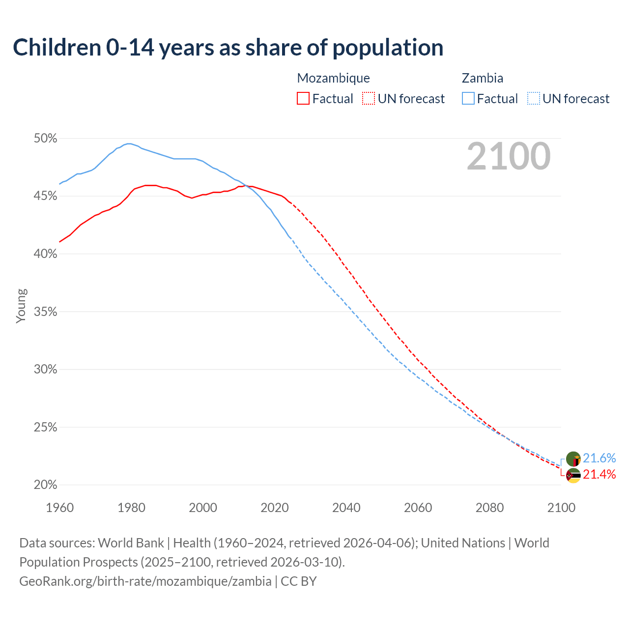 According to the latest available data on birth rates, the fertility rate in Mozambique was 4.76 children per woman in 2023, compared to 4.1 in Zambia in 2023. The replacement level is considered to be 2.1 children per woman.