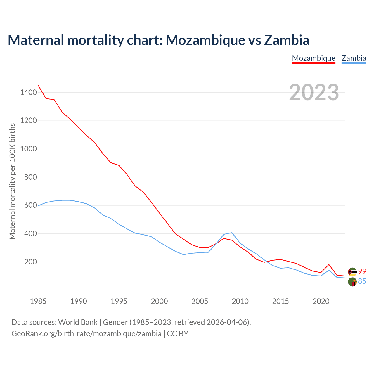 The maternal mortality rate, which is the probability of dying during childbirth or within 42 days of pregnancy termination, is 99 deaths per 100,000 live births in Mozambique, compared to 85 deaths in Zambia.