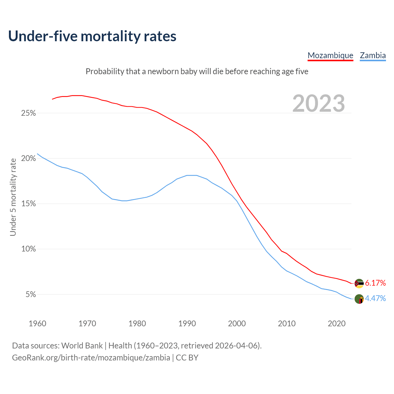 The chance that a newborn baby will die before reaching age five is 6.17% in Mozambique and 4.47% in Zambia. Above is a chart with historical data on under-five mortality rates.