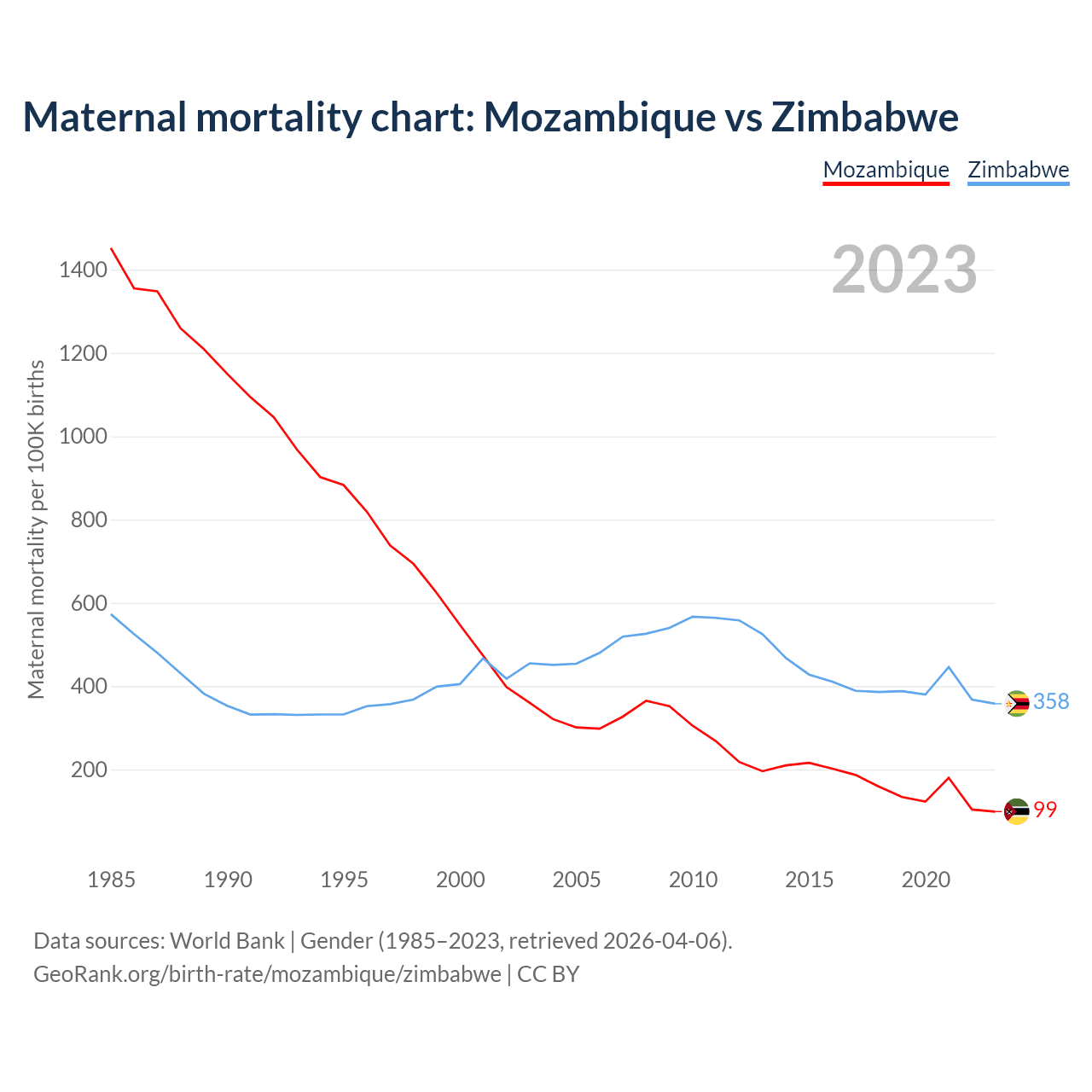 The maternal mortality rate, which is the probability of dying during childbirth or within 42 days of pregnancy termination, is 99 deaths per 100,000 live births in Mozambique, compared to 358 deaths in Zimbabwe.