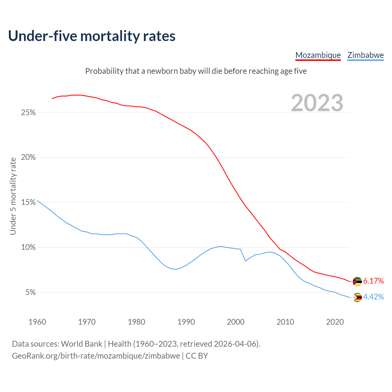 The chance that a newborn baby will die before reaching age five is 6.17% in Mozambique and 4.42% in Zimbabwe. Above is a chart with historical data on under-five mortality rates.