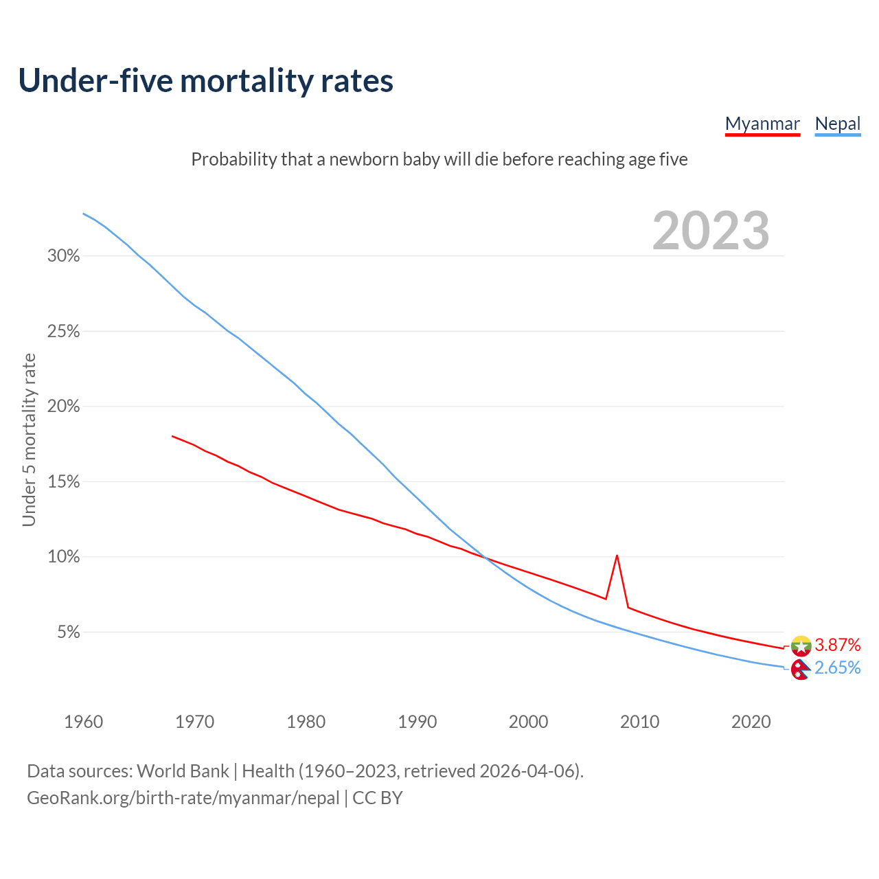 The chance that a newborn baby will die before reaching age five is 3.87% in Myanmar and 2.65% in Nepal. Above is a chart with historical data on under-five mortality rates.
