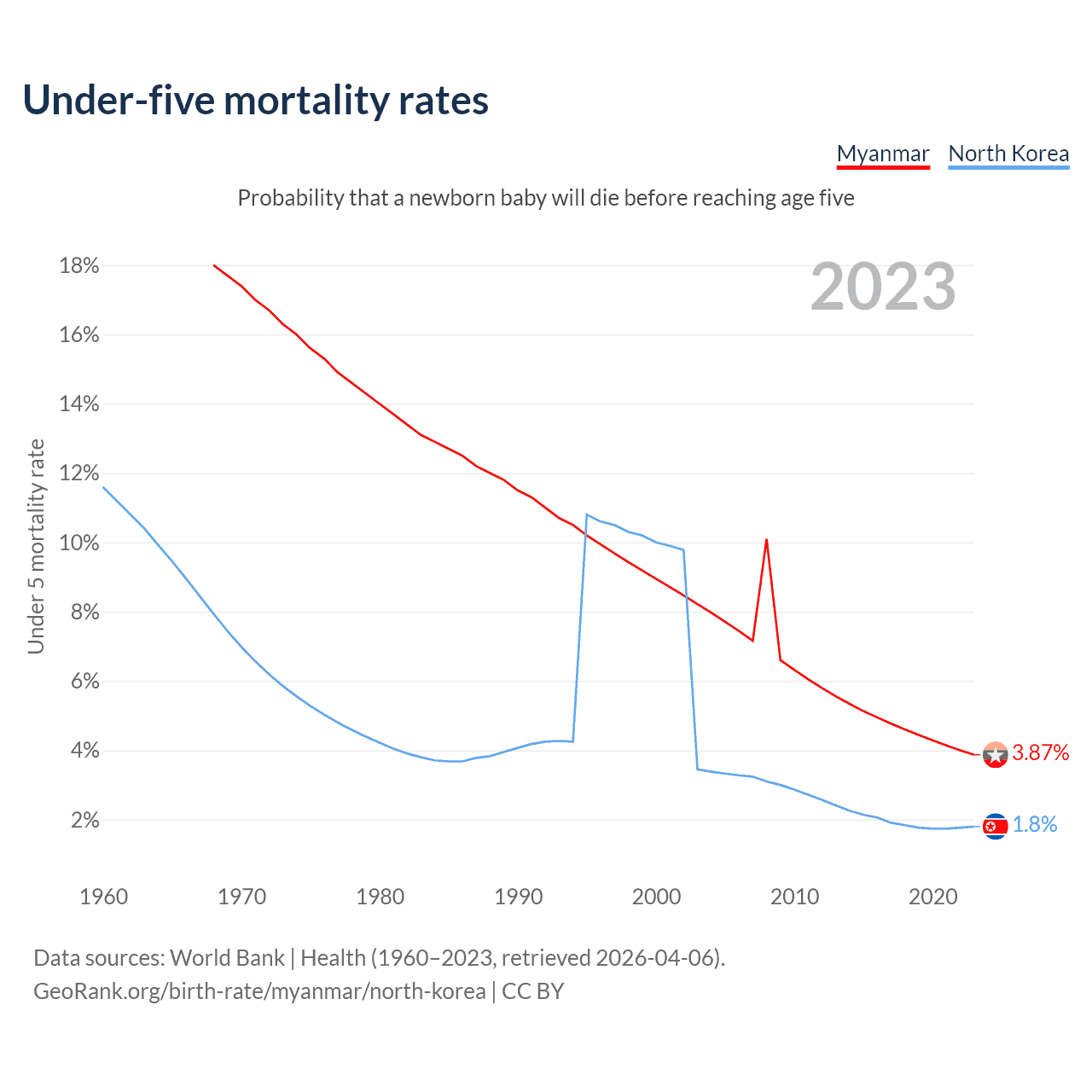The chance that a newborn baby will die before reaching age five is 3.87% in Myanmar and 1.8% in North Korea. Above is a chart with historical data on under-five mortality rates.
