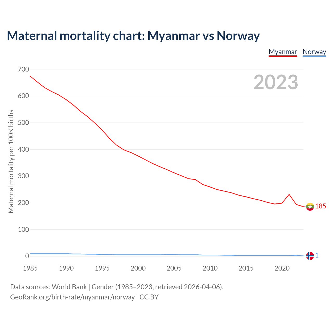 The maternal mortality rate, which is the probability of dying during childbirth or within 42 days of pregnancy termination, is 185 deaths per 100,000 live births in Myanmar, compared to 1 deaths in Norway.