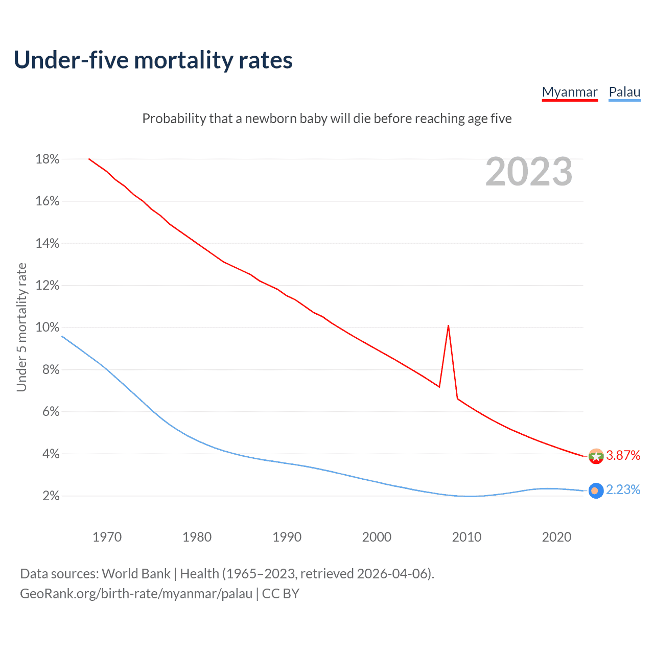 The chance that a newborn baby will die before reaching age five is 3.87% in Myanmar and 2.23% in Palau. Above is a chart with historical data on under-five mortality rates.