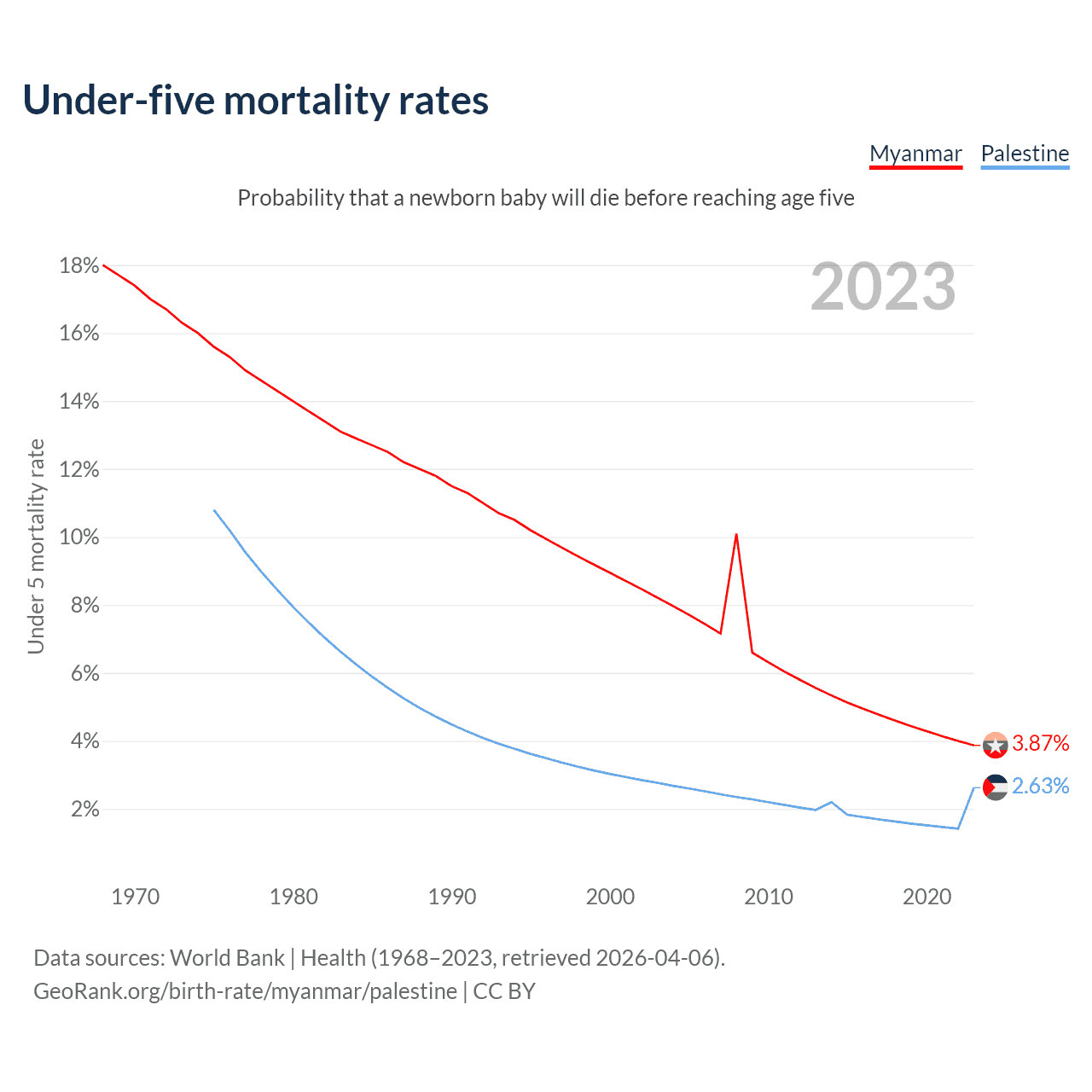 The chance that a newborn baby will die before reaching age five is 3.87% in Myanmar and 2.63% in Palestine. Above is a chart with historical data on under-five mortality rates.