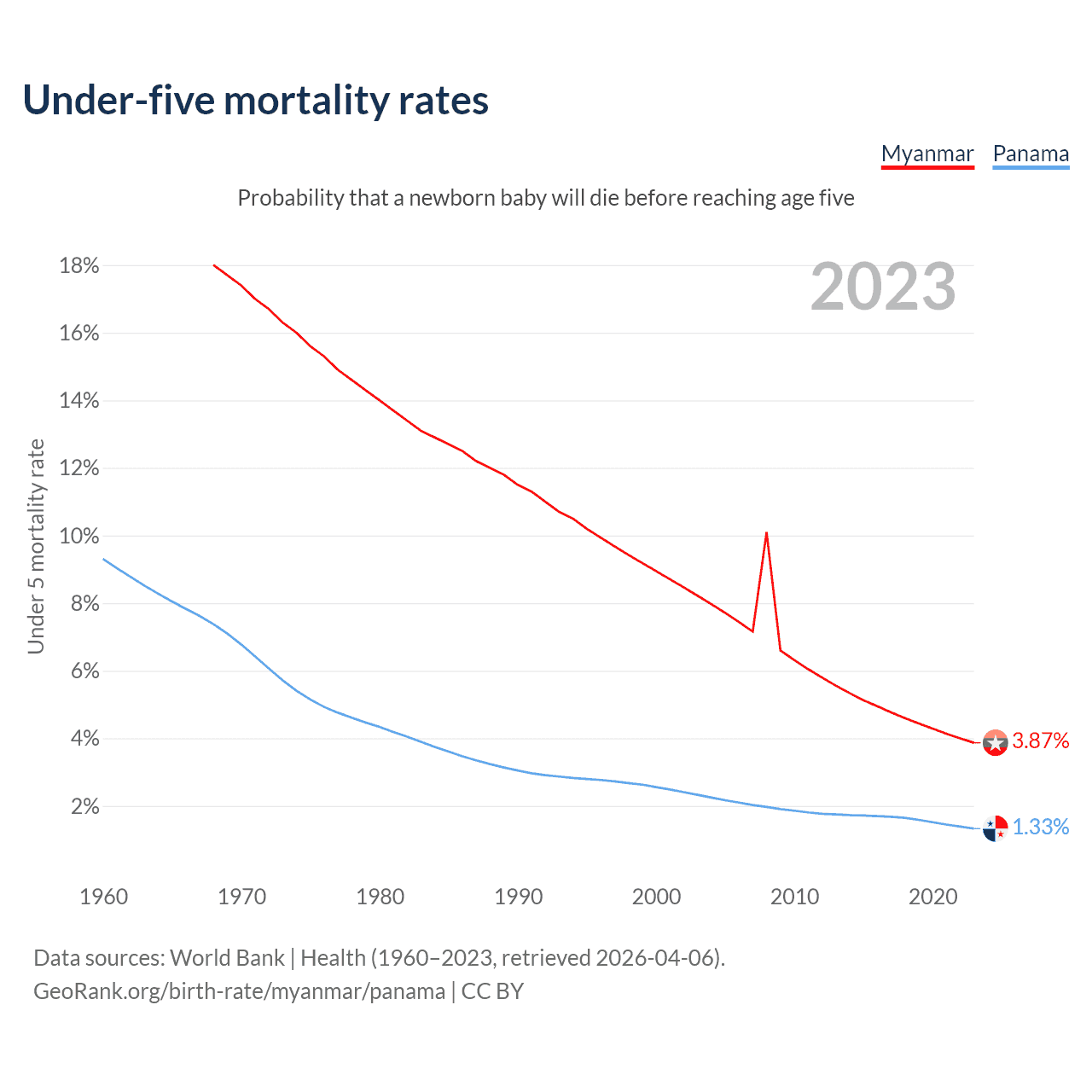The chance that a newborn baby will die before reaching age five is 3.87% in Myanmar and 1.33% in Panama. Above is a chart with historical data on under-five mortality rates.