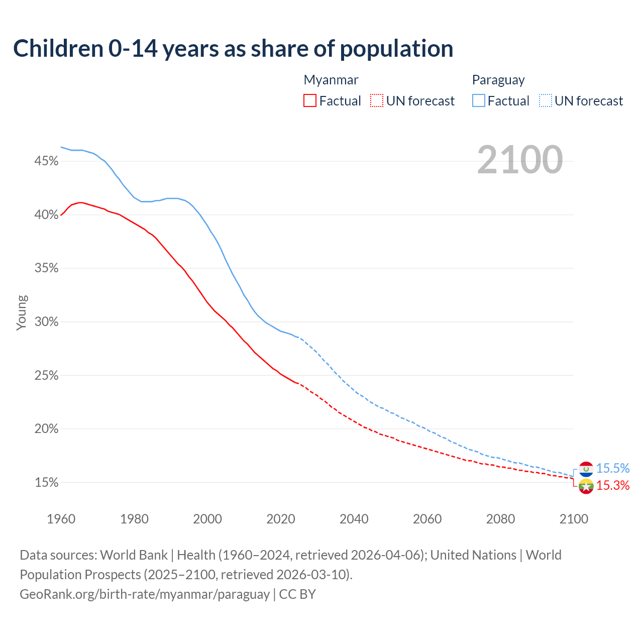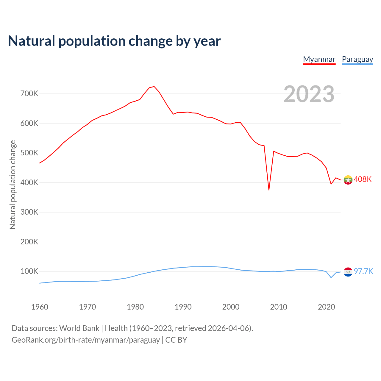 According to the latest available data on birth rates, the fertility rate in Myanmar was 2.12 children per woman in 2023, compared to 2.42 in Paraguay in 2023. The replacement level is considered to be 2.1 children per woman.