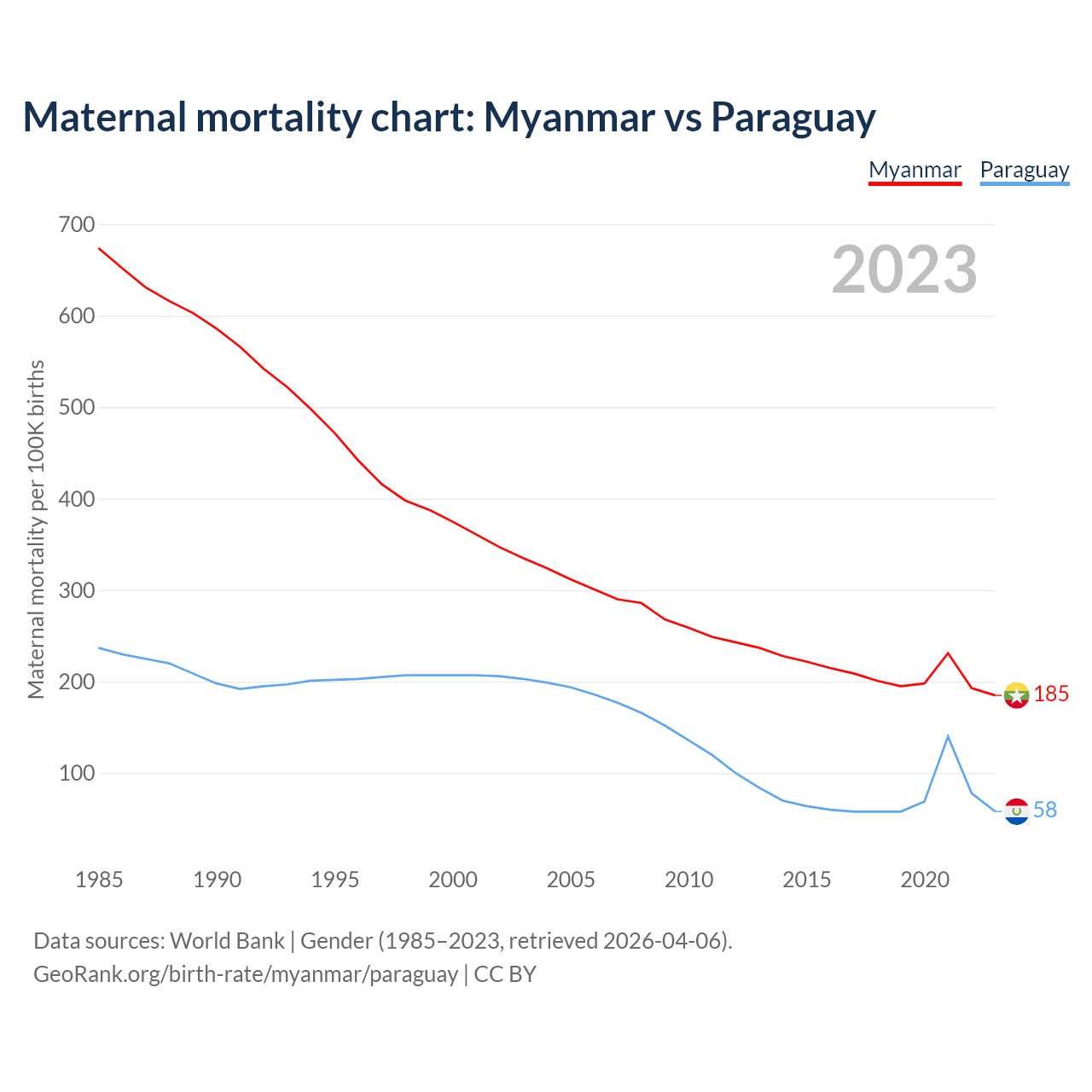 The maternal mortality rate, which is the probability of dying during childbirth or within 42 days of pregnancy termination, is 185 deaths per 100,000 live births in Myanmar, compared to 58 deaths in Paraguay.