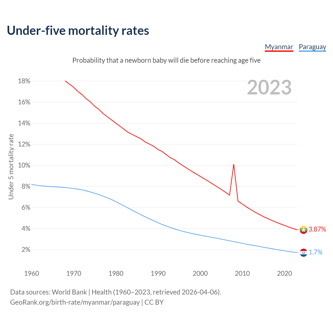 The chance that a newborn baby will die before reaching age five is 3.87% in Myanmar and 1.7% in Paraguay. Above is a chart with historical data on under-five mortality rates.