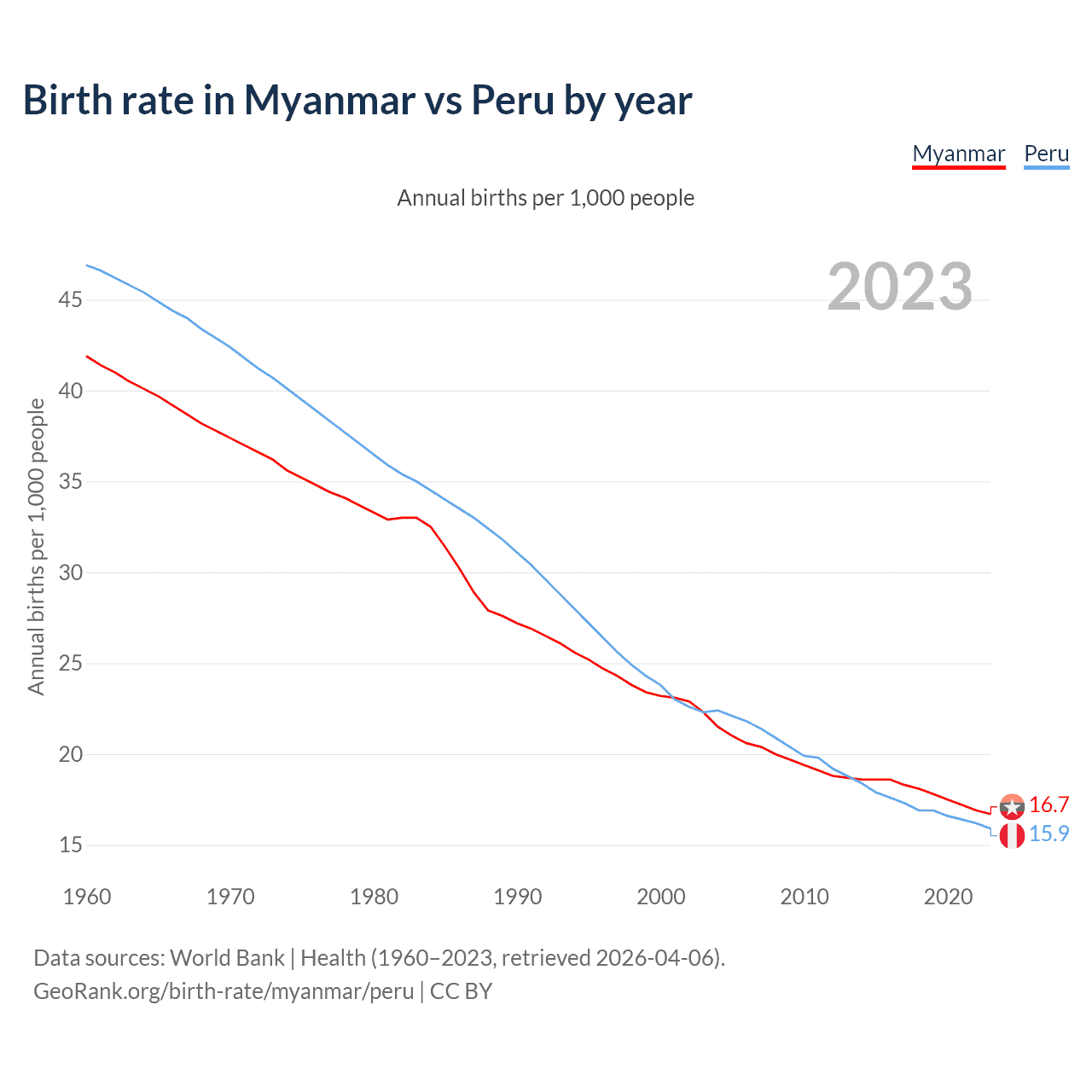 Myanmar has an annual birth rate of 16.7 births per 1,000 people, compared to 15.9 for Peru. The average number of children a woman is expected to have during her lifetime — the fertility rate, is 2.12 in Myanmar and 1.98 in Peru — 6.38% difference.