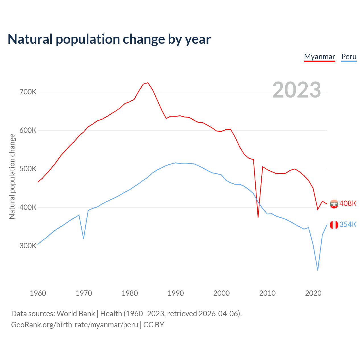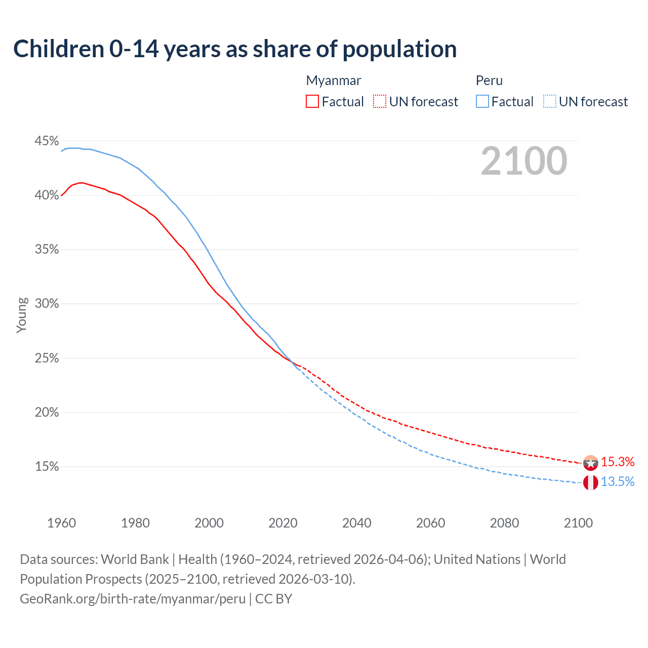 According to the latest available data on birth rates, the fertility rate in Myanmar was 2.12 children per woman in 2023, compared to 1.98 in Peru in 2023. The replacement level is considered to be 2.1 children per woman.