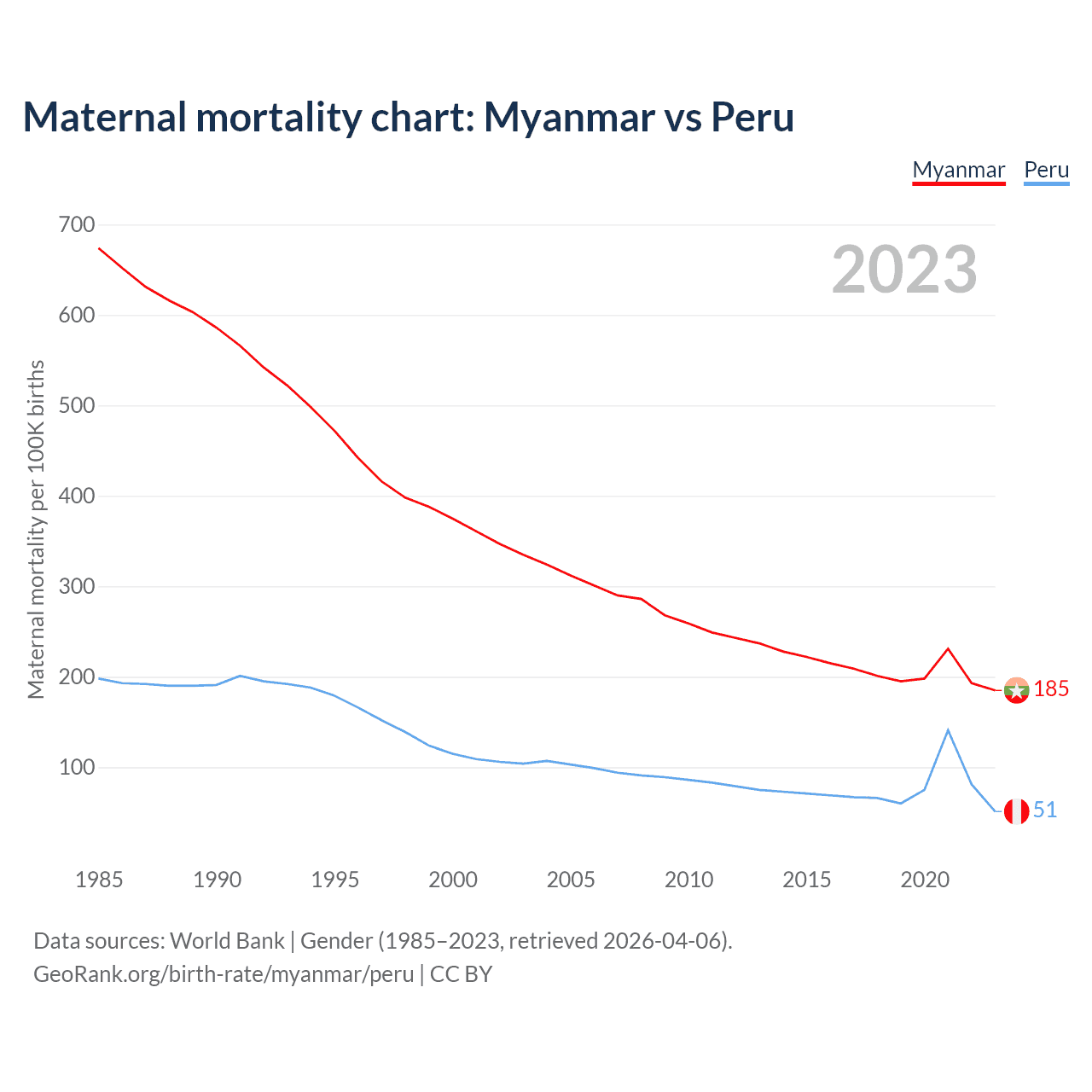 The maternal mortality rate, which is the probability of dying during childbirth or within 42 days of pregnancy termination, is 185 deaths per 100,000 live births in Myanmar, compared to 51 deaths in Peru.