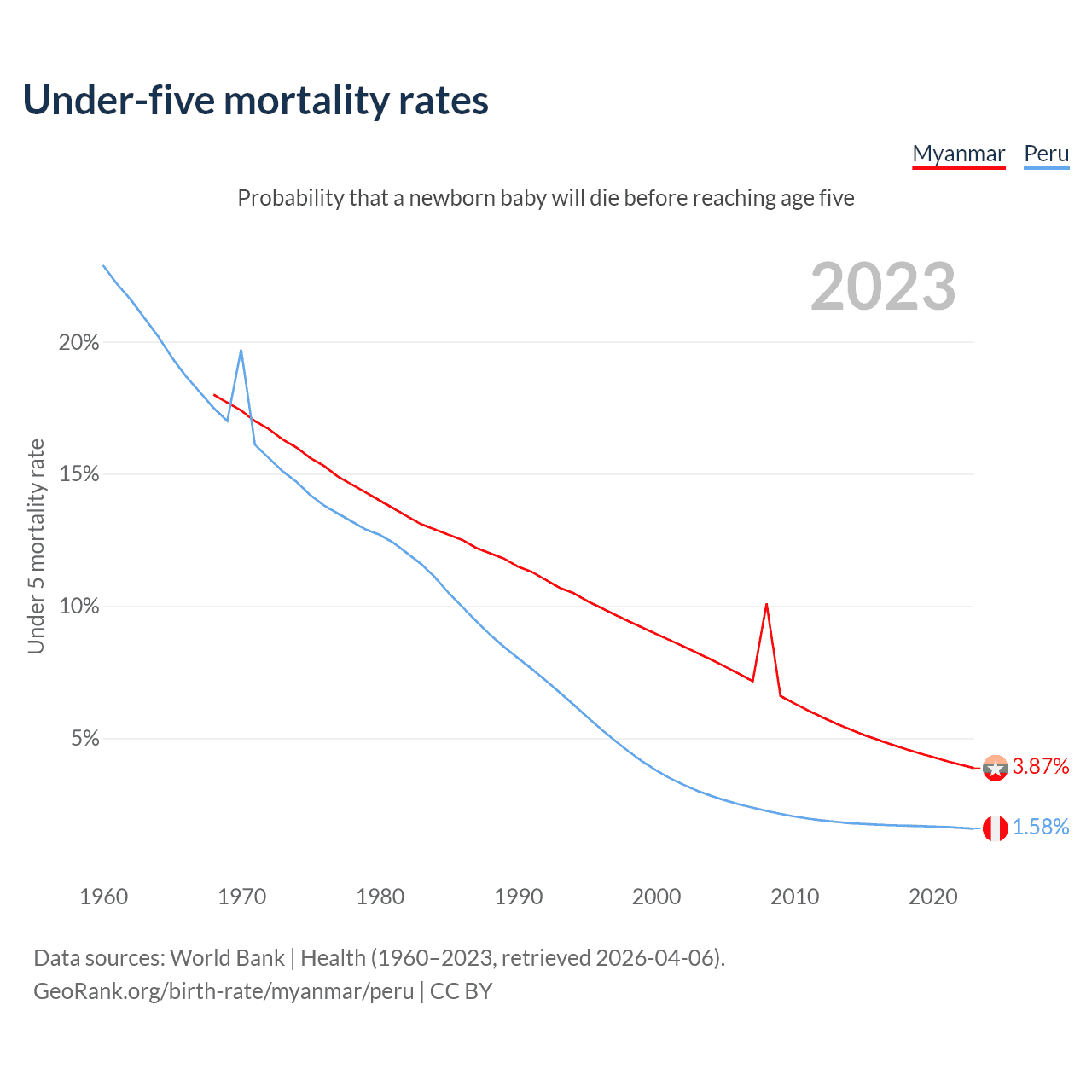 The chance that a newborn baby will die before reaching age five is 3.87% in Myanmar and 1.58% in Peru. Above is a chart with historical data on under-five mortality rates.