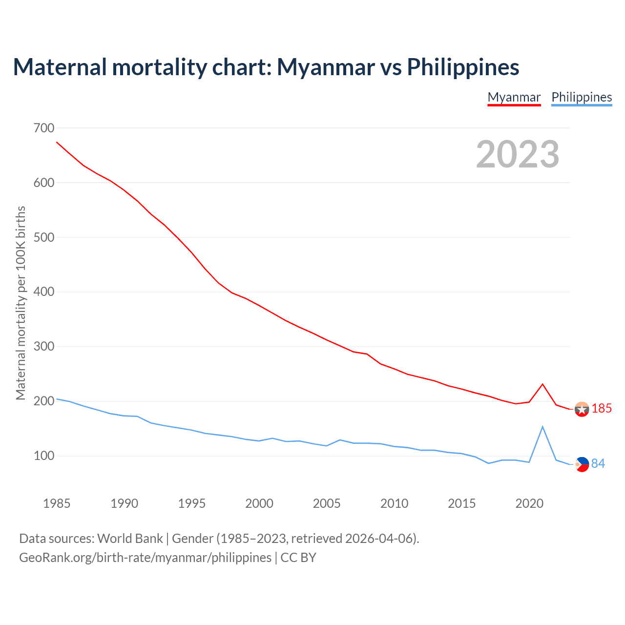 Data sources: World Bank | Gender (1985–2023, retrieved 2026-04-06).