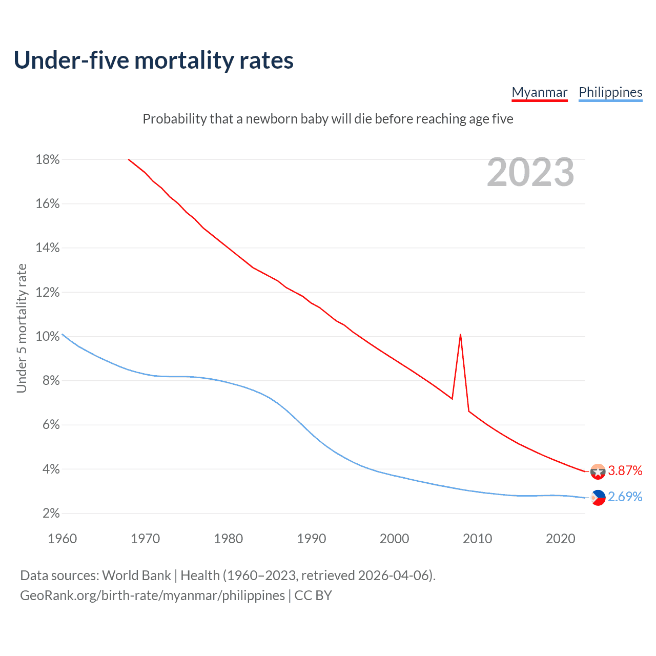 The chance that a newborn baby will die before reaching age five is 3.87% in Myanmar and 2.69% in the Philippines. Above is a chart with historical data on under-five mortality rates.