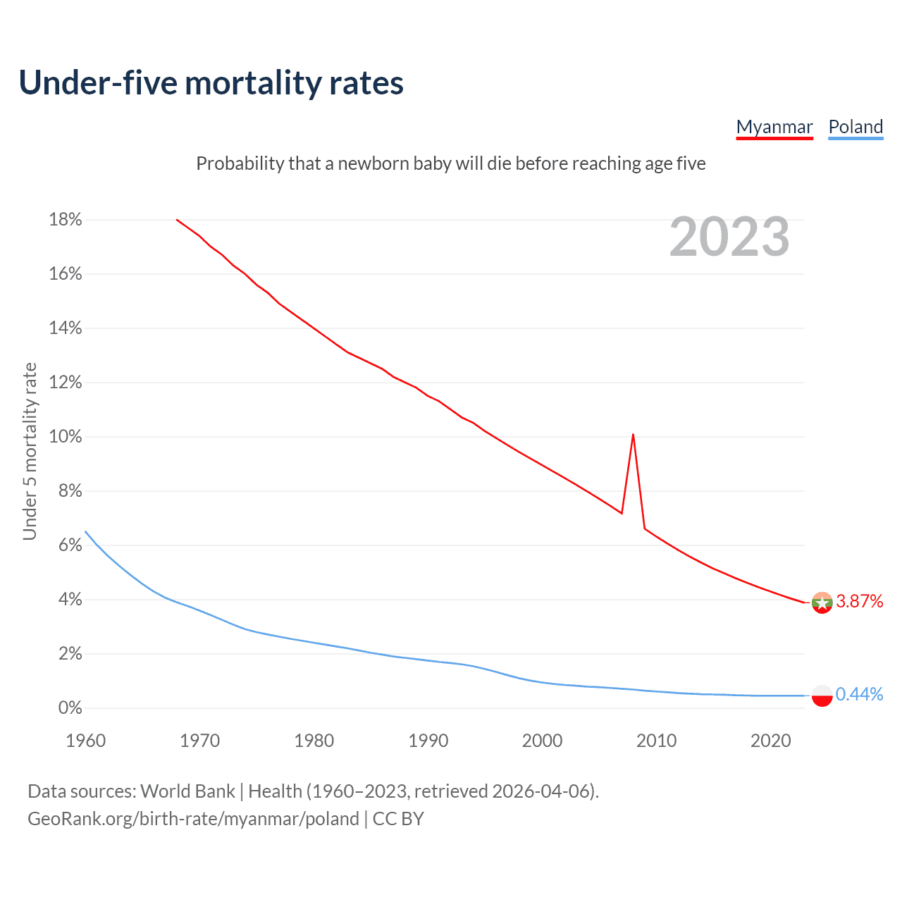 The chance that a newborn baby will die before reaching age five is 3.87% in Myanmar and 0.44% in Poland. Above is a chart with historical data on under-five mortality rates.
