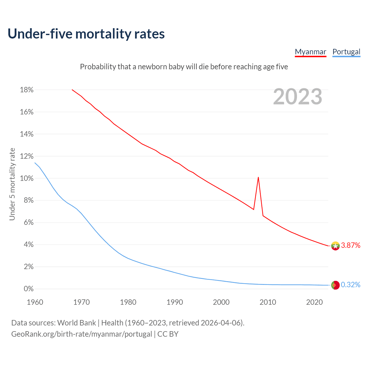 The chance that a newborn baby will die before reaching age five is 3.87% in Myanmar and 0.32% in Portugal. Above is a chart with historical data on under-five mortality rates.
