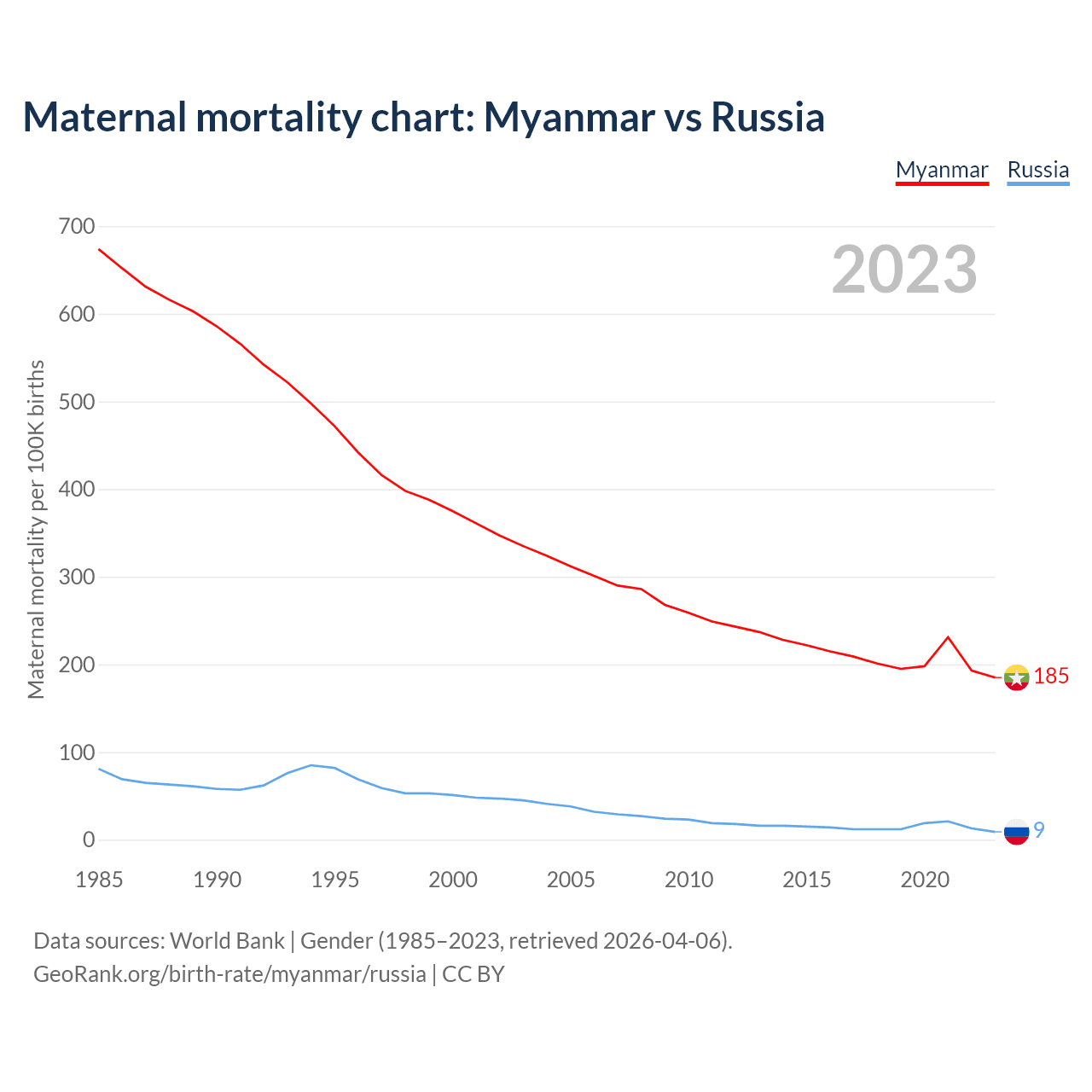 The maternal mortality rate, which is the probability of dying during childbirth or within 42 days of pregnancy termination, is 185 deaths per 100,000 live births in Myanmar, compared to 9 deaths in Russia.
