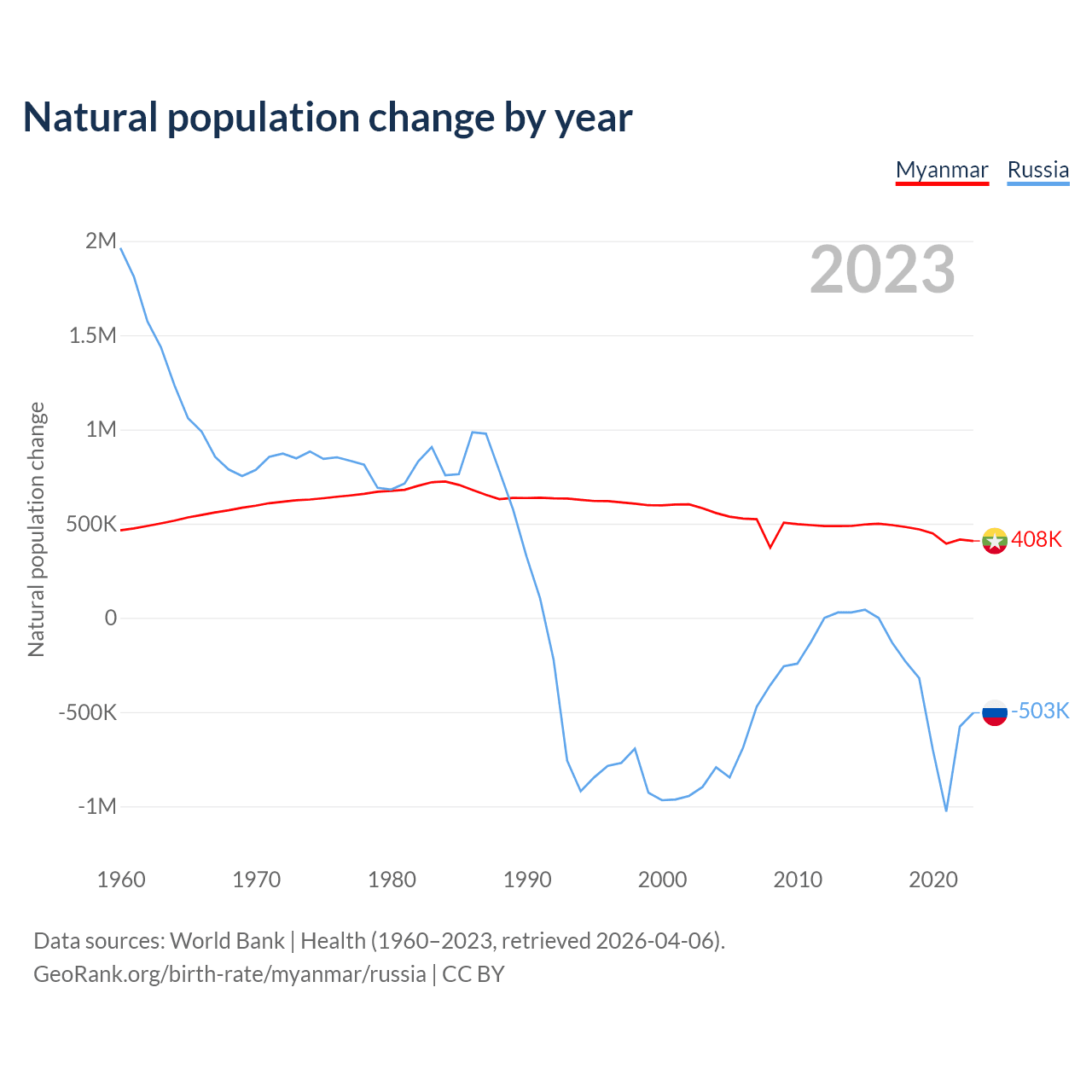 Myanmar has an annual birth rate of 16.7 births per 1,000 people, compared to 8.6 for Russia. The average number of children a woman is expected to have during her lifetime — the fertility rate, is 2.12 in Myanmar and 1.41 in Russia — 33.3% difference.