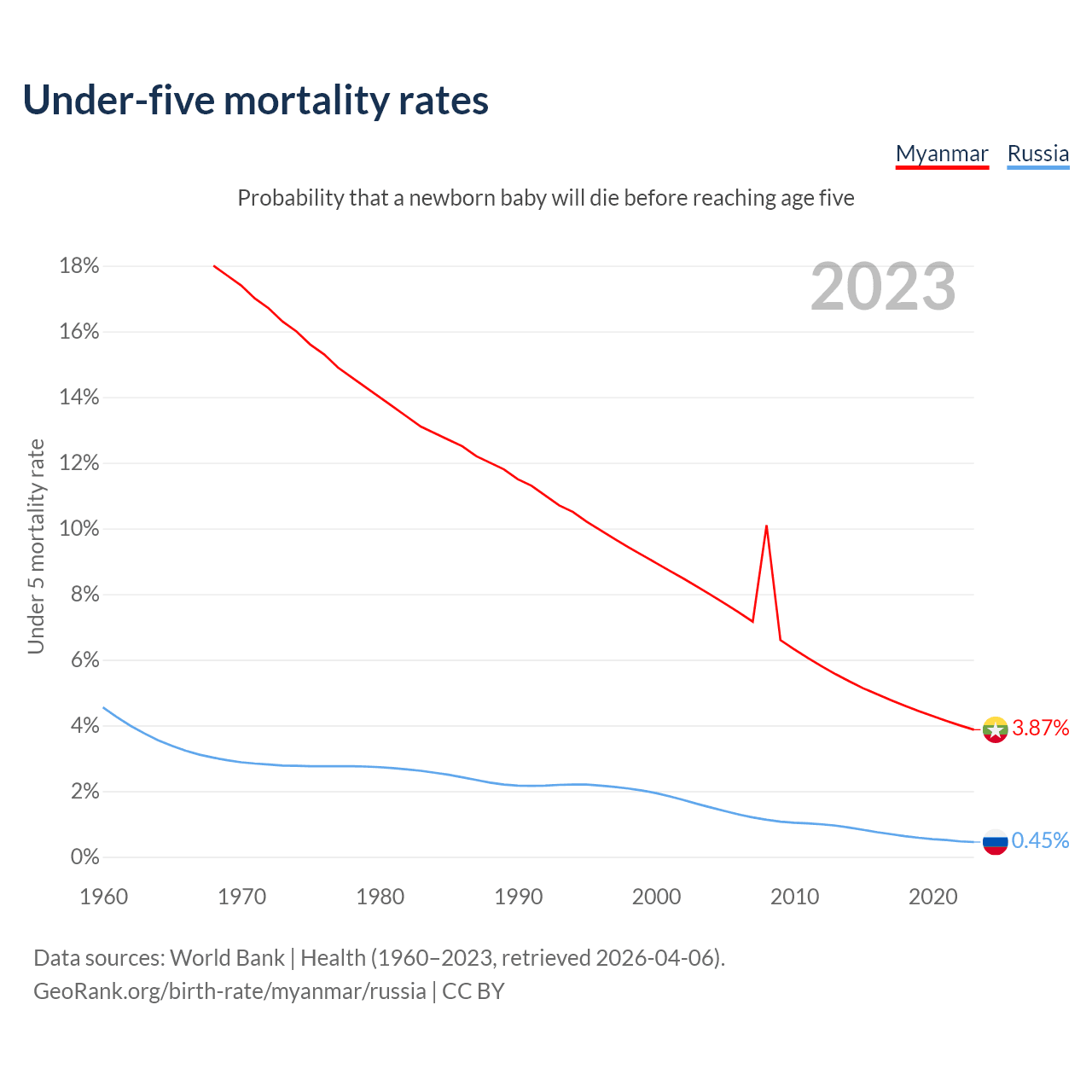 The chance that a newborn baby will die before reaching age five is 3.87% in Myanmar and 0.45% in Russia. Above is a chart with historical data on under-five mortality rates.
