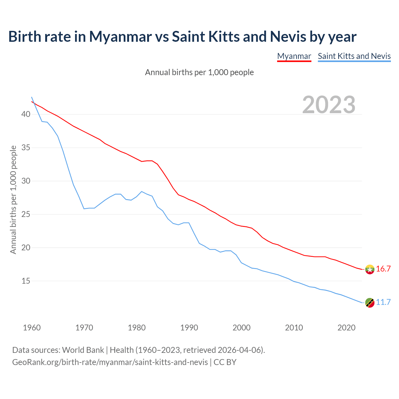 Myanmar has an annual birth rate of 16.7 births per 1,000 people, compared to 11.7 for Saint Kitts and Nevis. The average number of children a woman is expected to have during her lifetime — the fertility rate, is 2.12 in Myanmar and 1.51 in Saint Kitts and Nevis — 28.8% difference.