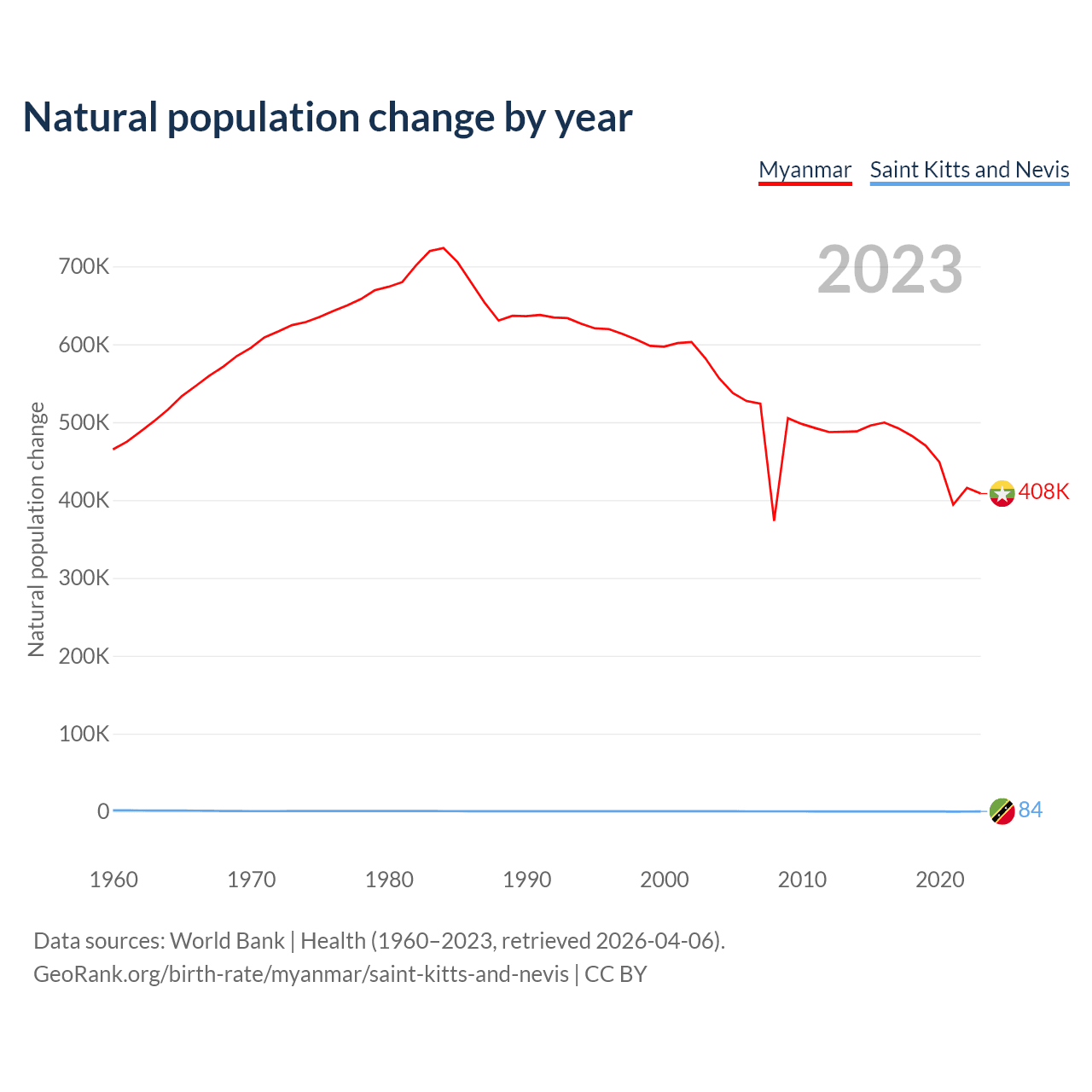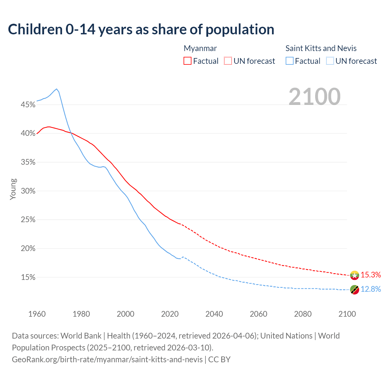 According to the latest available data on birth rates, the fertility rate in Myanmar was 2.12 children per woman in 2023, compared to 1.51 in Saint Kitts and Nevis in 2023. The replacement level is considered to be 2.1 children per woman.