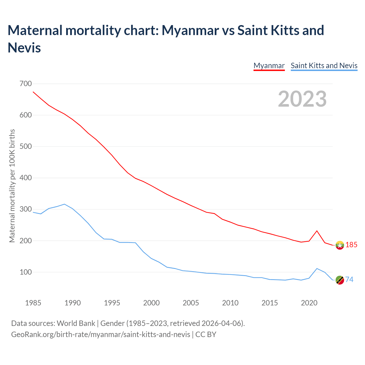 The maternal mortality rate, which is the probability of dying during childbirth or within 42 days of pregnancy termination, is 185 deaths per 100,000 live births in Myanmar, compared to 74 deaths in Saint Kitts and Nevis.