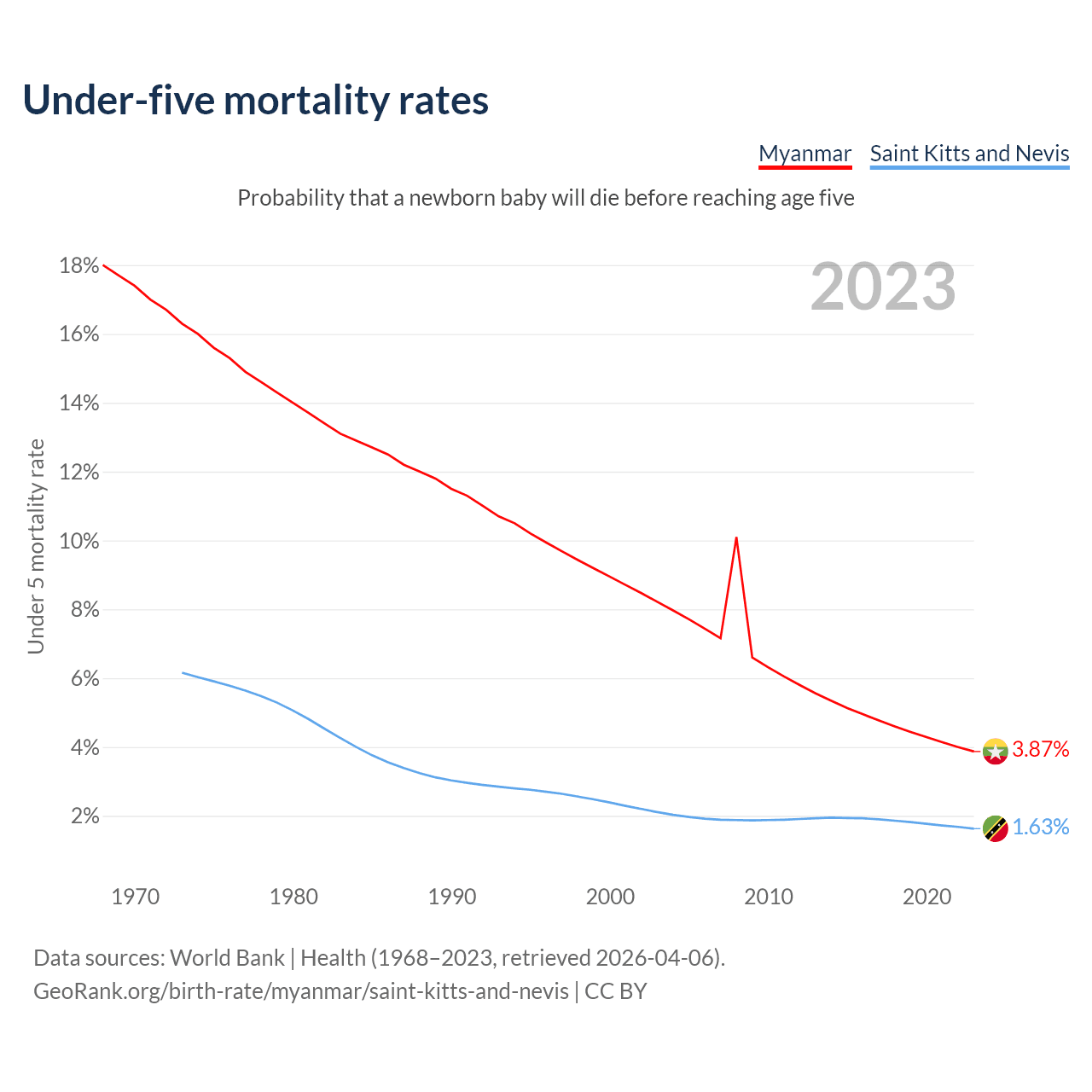 The chance that a newborn baby will die before reaching age five is 3.87% in Myanmar and 1.63% in Saint Kitts and Nevis. Above is a chart with historical data on under-five mortality rates.