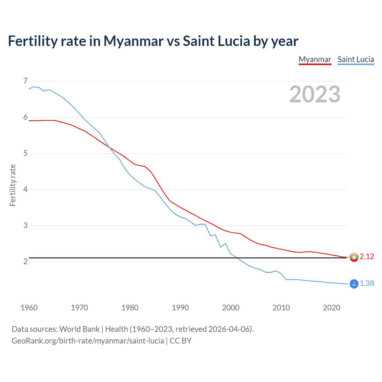 According to the latest available data on birth rates, the fertility rate in Myanmar was 2.12 children per woman in 2023, compared to 1.38 in Saint Lucia in 2023. The replacement level is considered to be 2.1 children per woman.