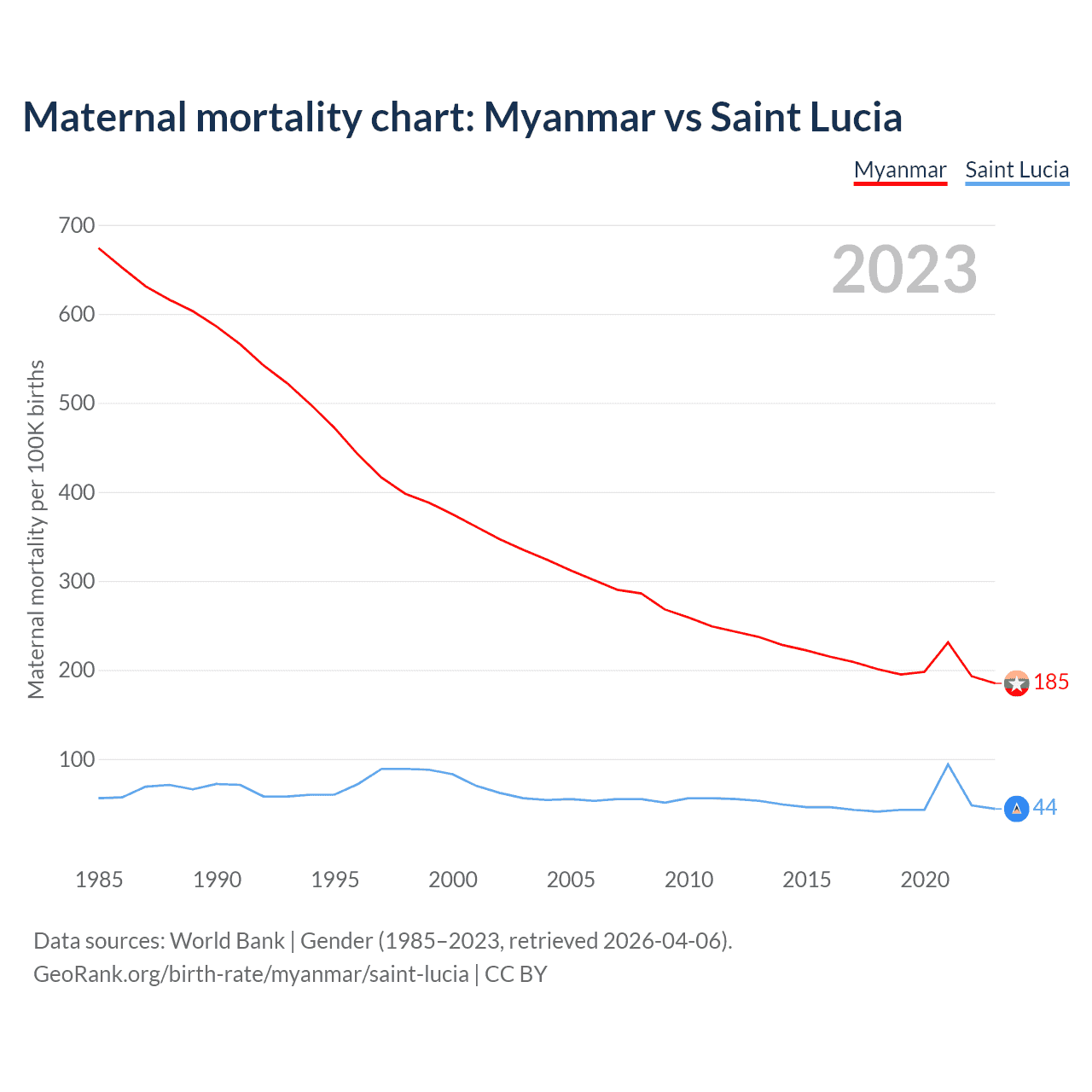 The maternal mortality rate, which is the probability of dying during childbirth or within 42 days of pregnancy termination, is 185 deaths per 100,000 live births in Myanmar, compared to 44 deaths in Saint Lucia.